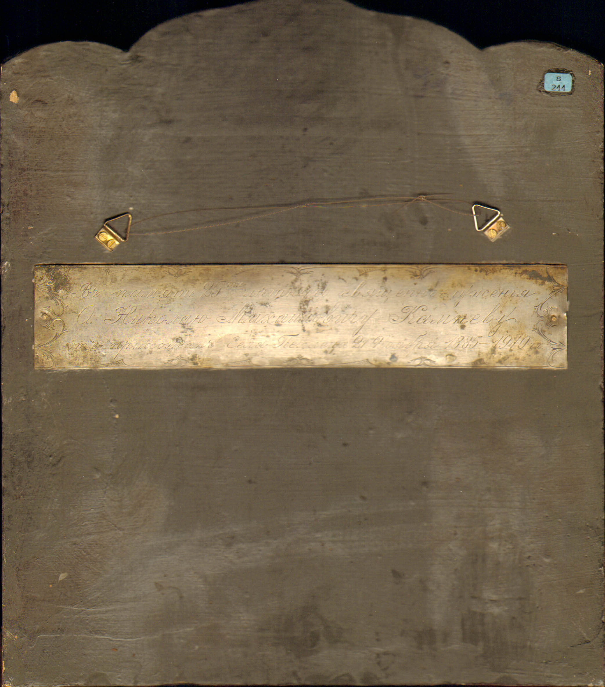 Moeder Gods Feodorovskaja. Op de achterzijde een opdracht t.g.v. een zilveren jubileum: "Ter herinnering aan de 25-jarige wijding van vader Nikolaj Michailovic Kamnev uit nabijgelegen dorp Pechlets op 21 november 1885-1910"
