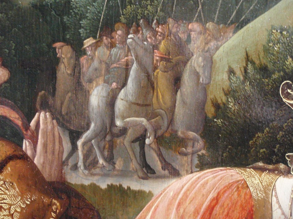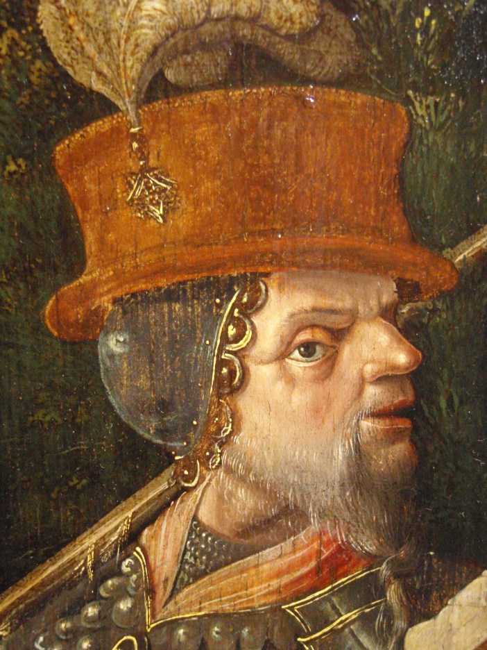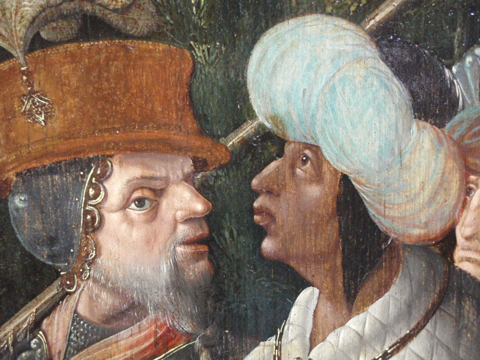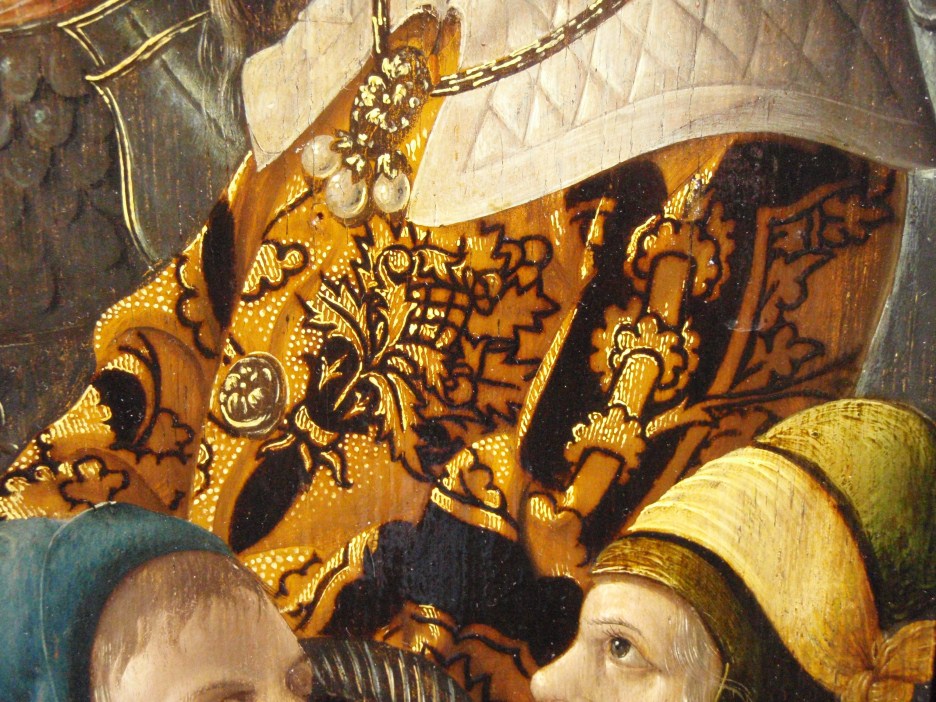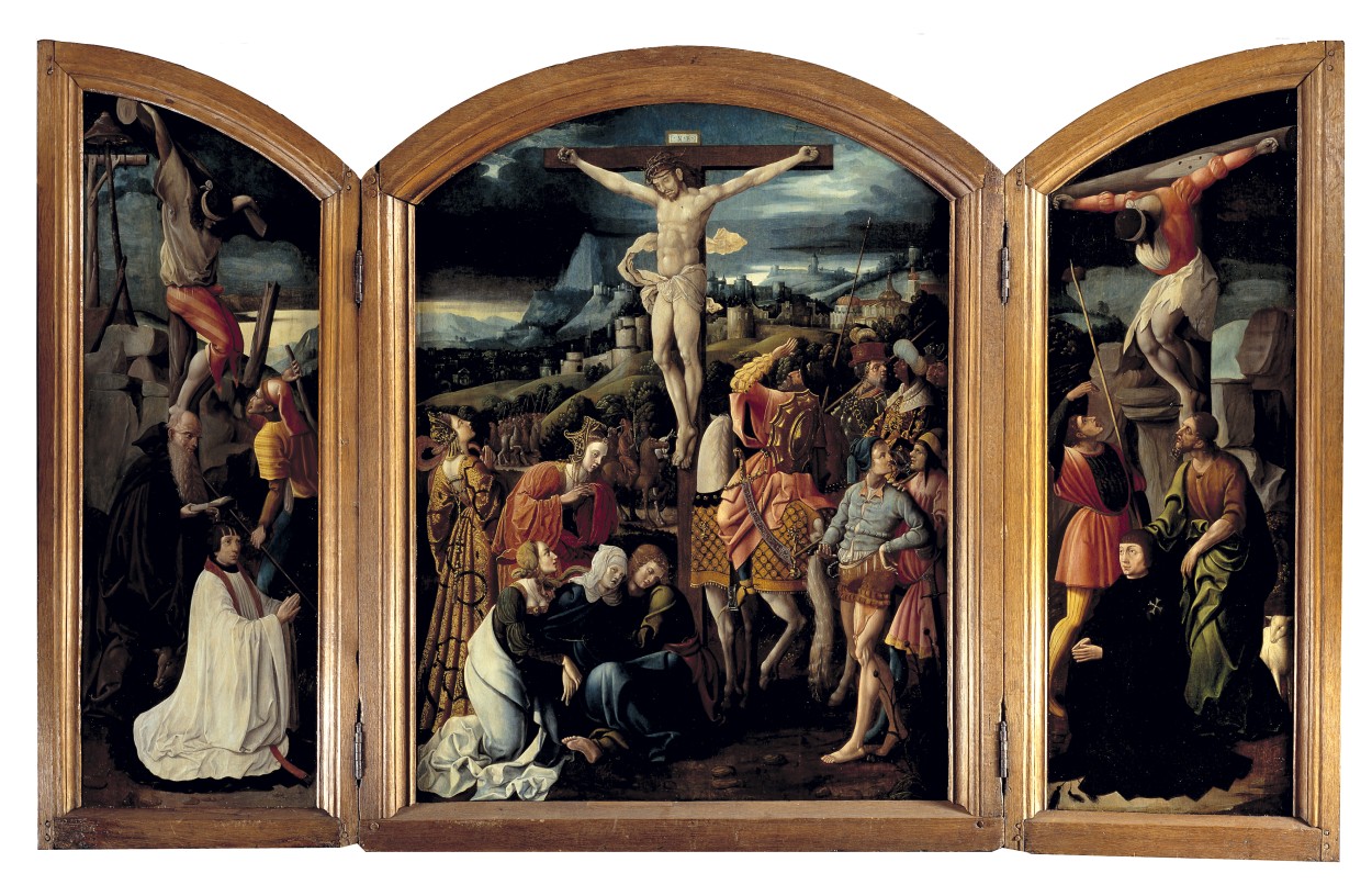 Drieluik, memorietafel met Kruisiging en twee stichters.