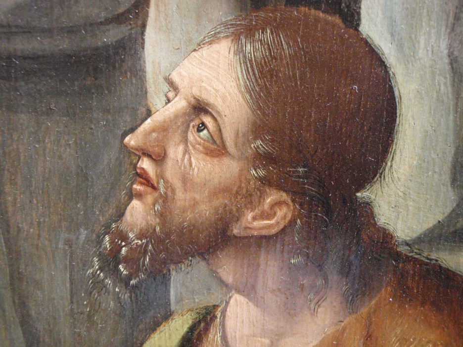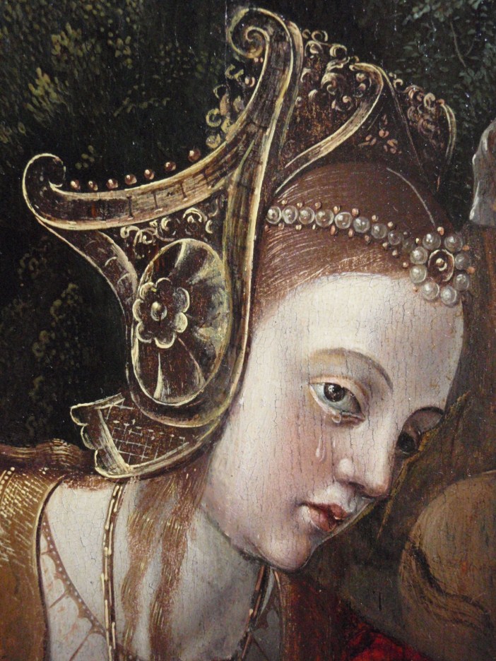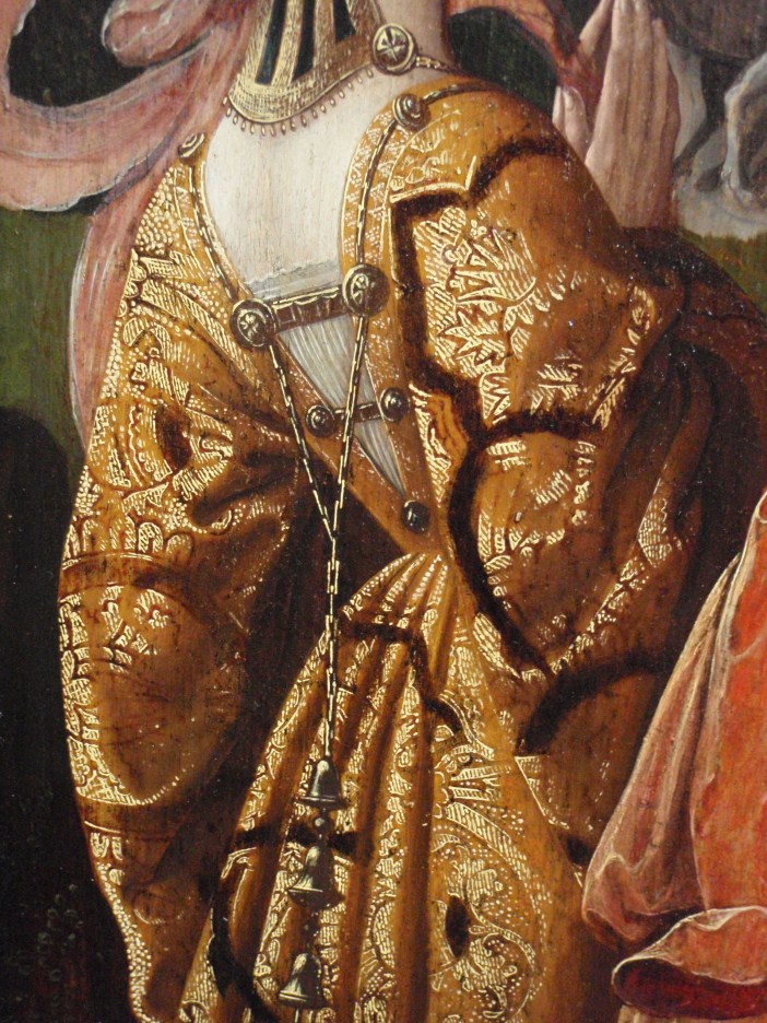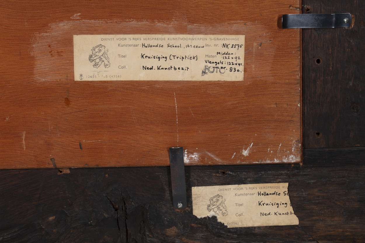 De kruisigingsscène van het middenpaneel zet zich voort op de luiken met links de goede en rechts de slechte moordenaar. Op de sierband langs de halsuitsnijding van het kleed van de vrouw, die samen met Johannes Maria ondersteunt, de inscriptie: MVLIER AD[.]IC B [...] (Vrouw ...). Het drieluik is een memorietafel van Dirk van Noordwijk ...