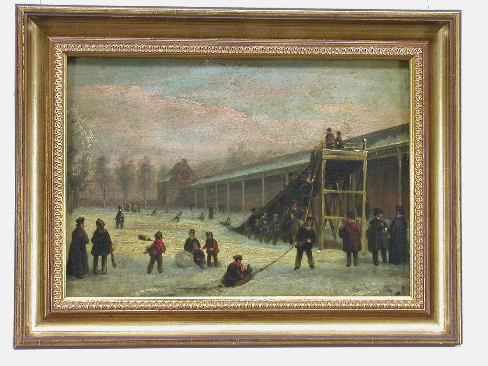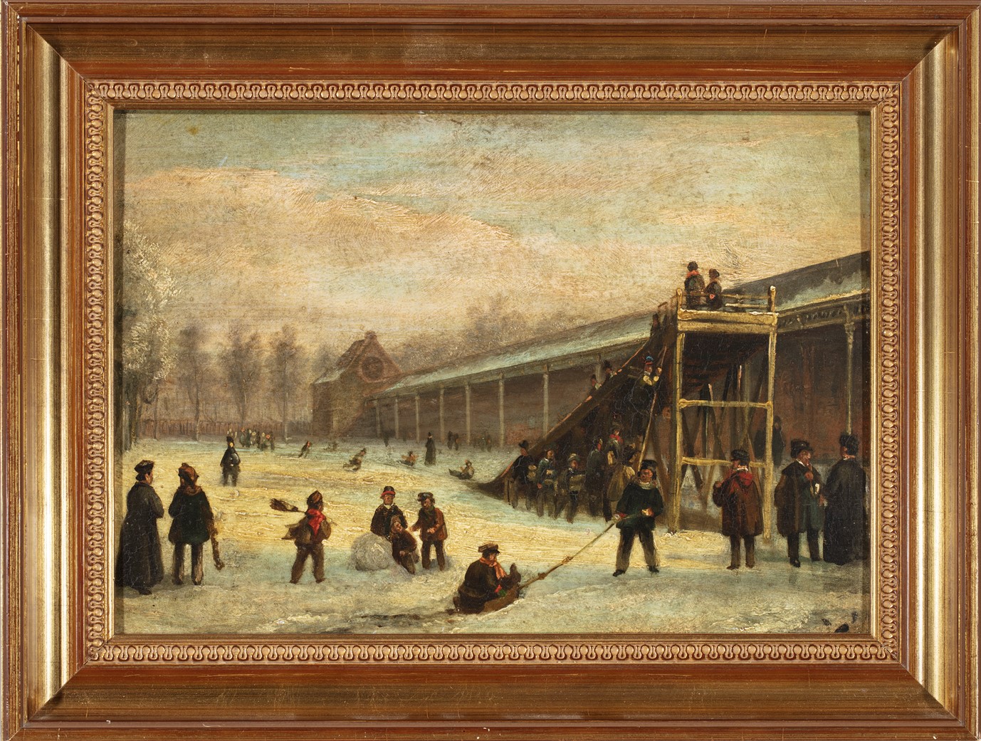 Winterse blik op de cour van het Willibrorduscollege in Katwijk, met de ‘Montagne Russe’ en spelende kinderen
