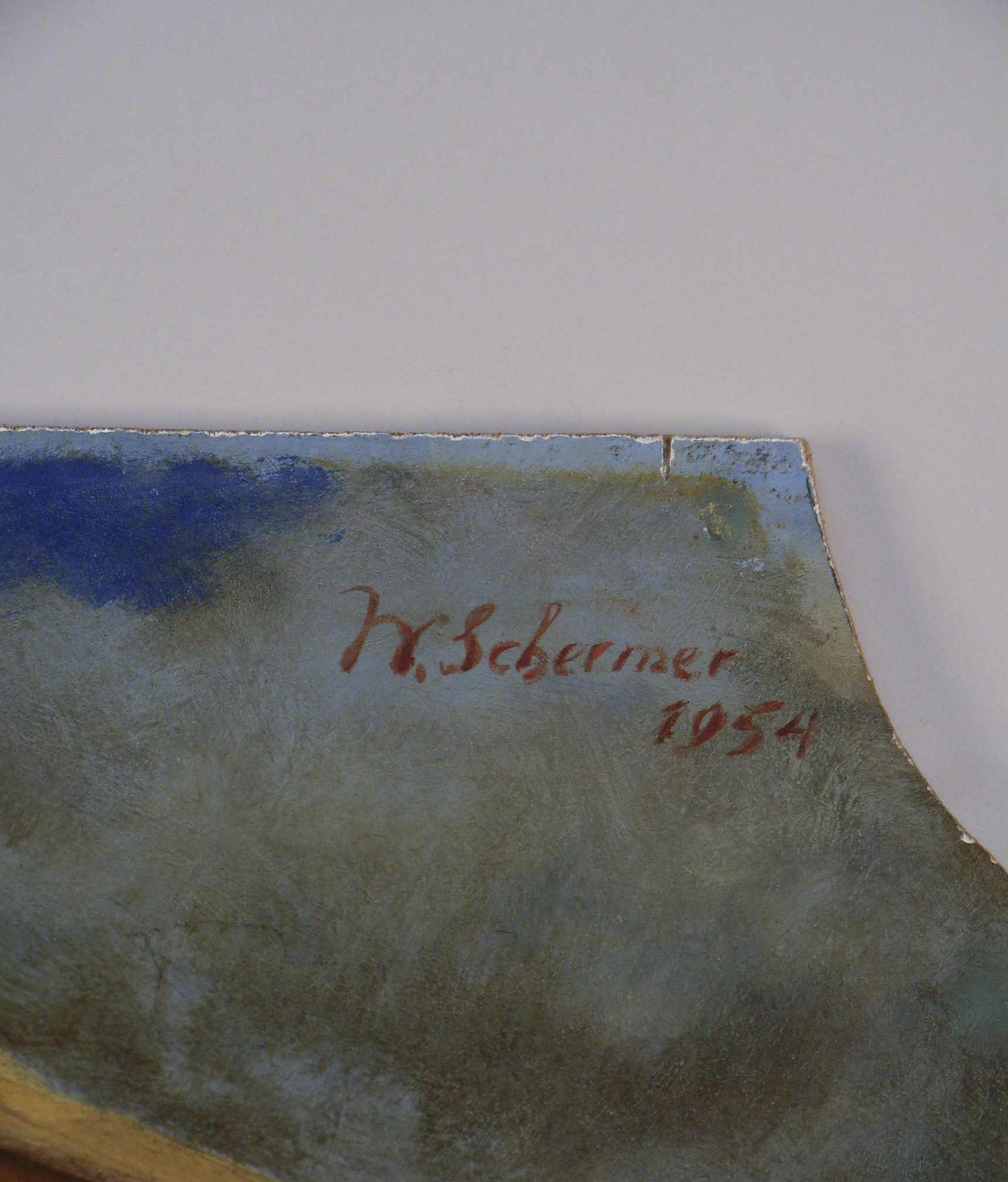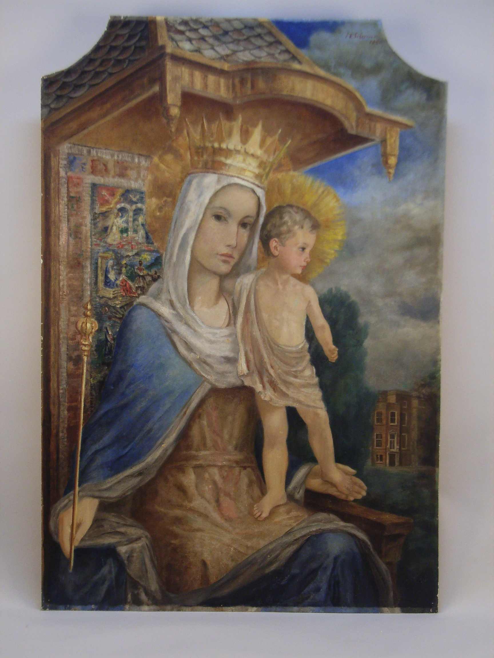 Schouwstuk met centraal een tronende en gekroonde Maria, met het Kind staande op haar schoot, rechts in de achtergrond het hoofdgebouw van Katwijk-de Breul