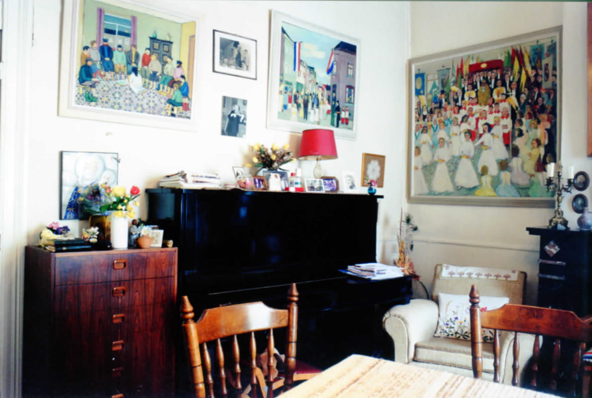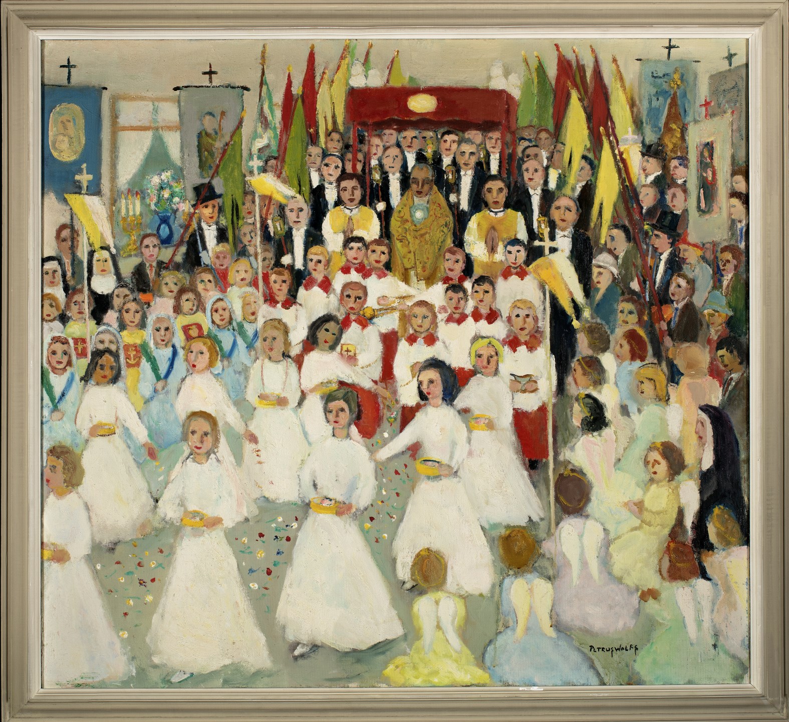 Gesigneerd rechtsonder: Petrus Wolfs. Processie op Bronkzondag te Eijsden. Onder een baldakijn draagt een priester een monstrans met het Allerheiligst sacrament, de geconsacreerde hostie. Vooraan strooien meisjes gekleed als bruidjes bloemen. Zij worden gevolgd door misdienaars. Links en rechts knielen mensen. Rechts op de voorgrond knielen meisjes die als engelen verkleed zijn.