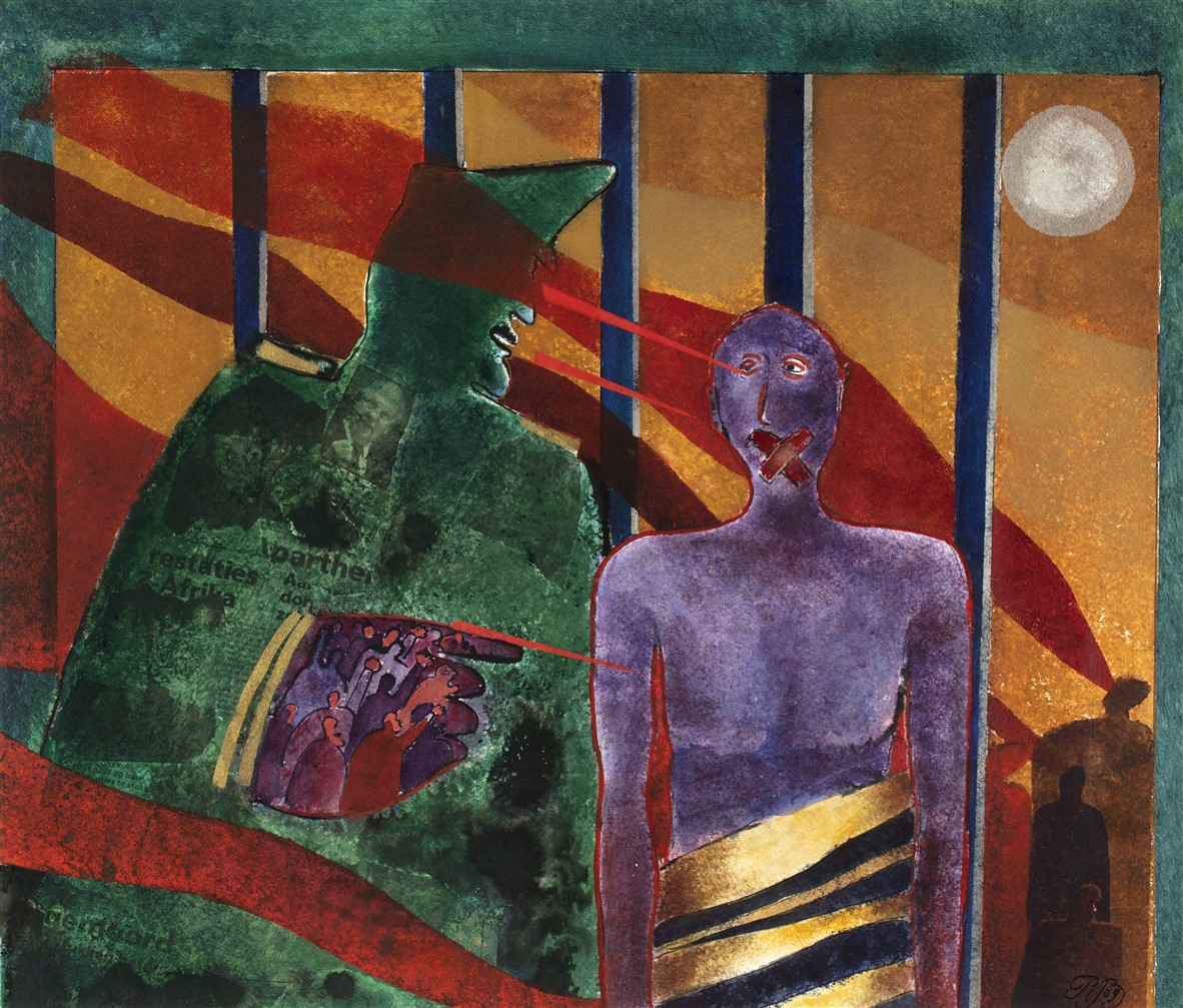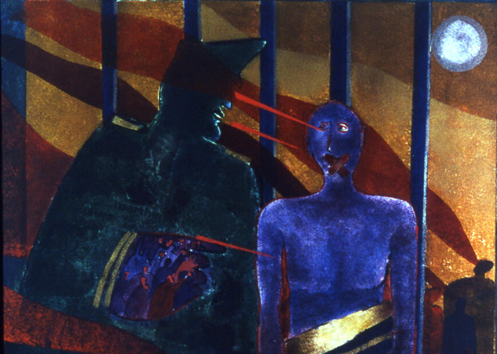 Kruiswegstatie: Jezus voor Pilatus. Gesigneerd en gedateerd in zwart rechtsonder: R B 89 (89 in B). Beschrijving door Ruud Bartlema: Eerste statie, Matth.27:11-14 Jezus en Pilatus staan beiden achter de tralies, want in deze situatie , waarin ze tegenover elkaar staan, blijft de vraag open, wie gevangen en wie vrij is. Jezus draagt een Joodse ...