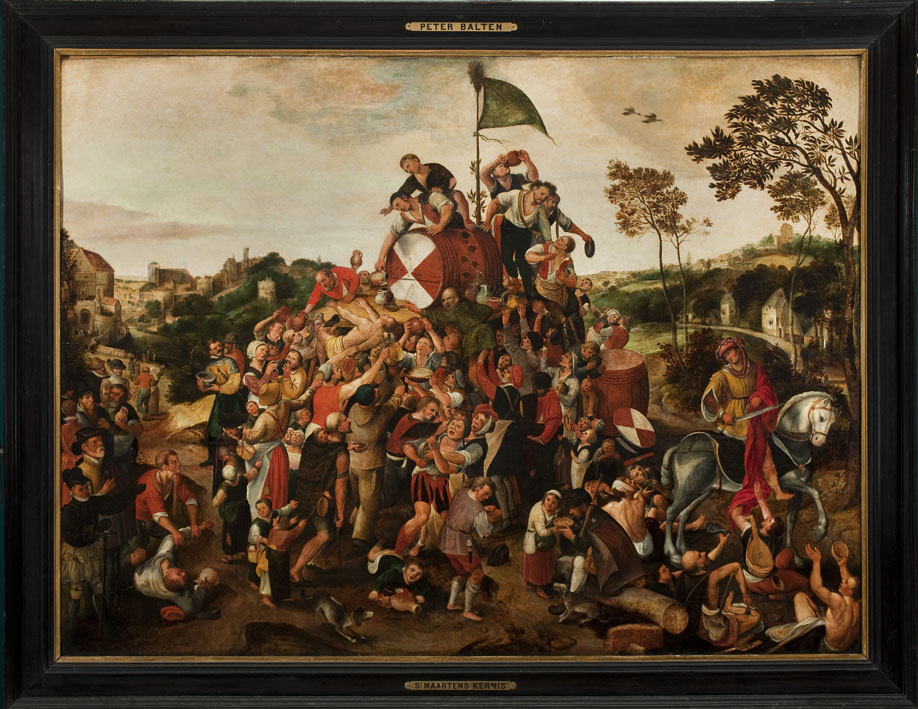 Gesigneerd op de steen links op de voorgrond: PEETER BALTEN. Op de vlag twee gekruiste krukken en de inscriptie: SINT MAE[RTEN]. Rechts Martinus te paard die zijn mantel afsnijdt voor een bedelaar.