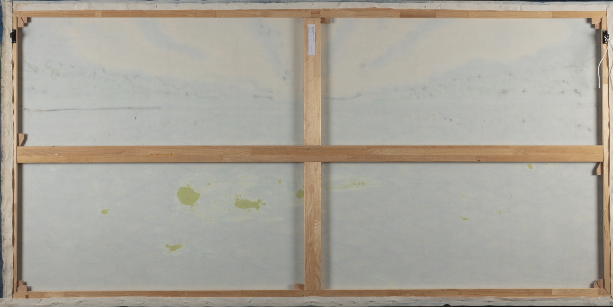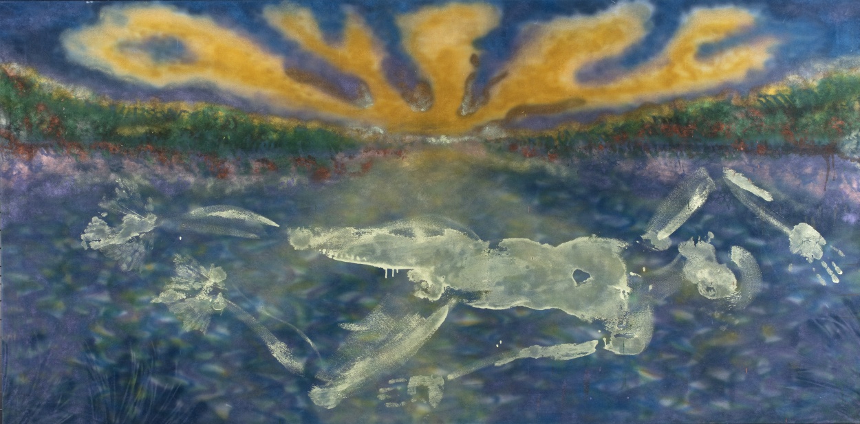 In het water ligt een volledig afgebeeld mensfiguur tegen een achtergrond van een opkomende of ondergaande zon in een kleurrijk landschap.