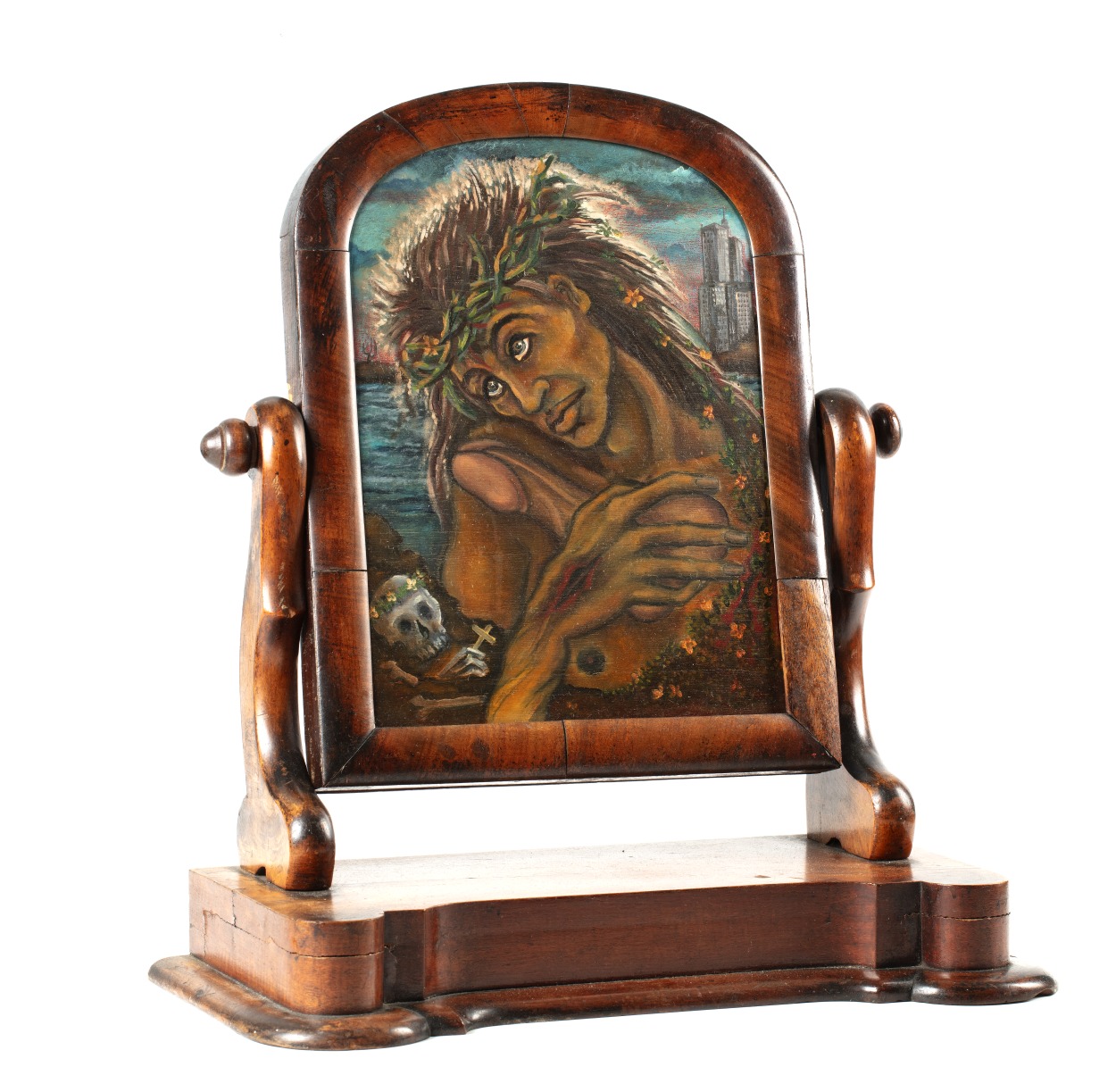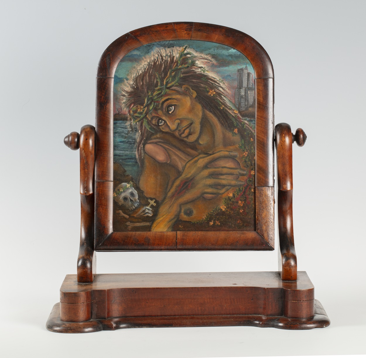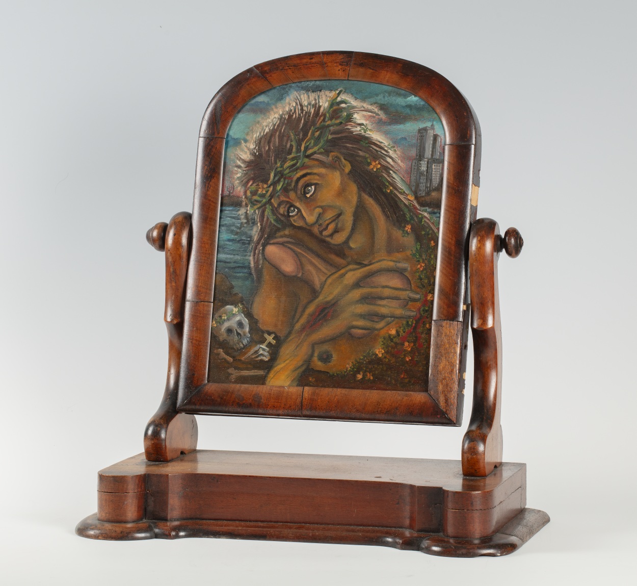 Een zwarte Christusfiguur omarmt een penis. De figuur draagt een doornenkroon. Op zijn hand zijn stigmata te zien. Op de voorgrond vanitas symbolen. Op de achtergrond een mogelijk eigentijds Jeruzalem in de vorm van de skyline New York. Links op de achtergrond zien we cactussen, die verwijzen naar de Caribische oorsprong van De Rooy. Het ...