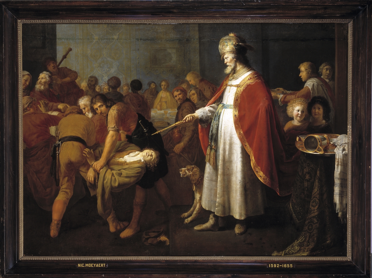De gelijkenis van de onwaardige bruiloftsgast (Mat. 22:1-15) In een rijkelijk met tapijten behangen zaal bevindt zich een uitgebreid gezelschap dat bijeen voor het bruiloftszaal van de zoon van de koning. Deze koning beheerst, en profil en ten voeten uit weergegeven, het rechterbeeldvlak en wordt begeleid door een hond die kwaadaardig zijn tanden ontbloot. Met ...