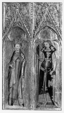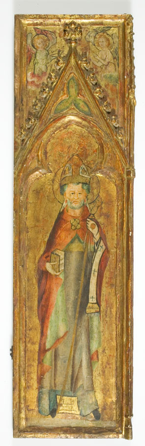 Linkerluik van een reliek(?)altaar met de Annunciatie (boven) en Geboorte van Christus (onder); op de banderol van Gabriël het opschrift: AVE GRATIA PLENA (Wees gegroet begenadigde). Op de buitenzijde een bisschop (H. Anno?).