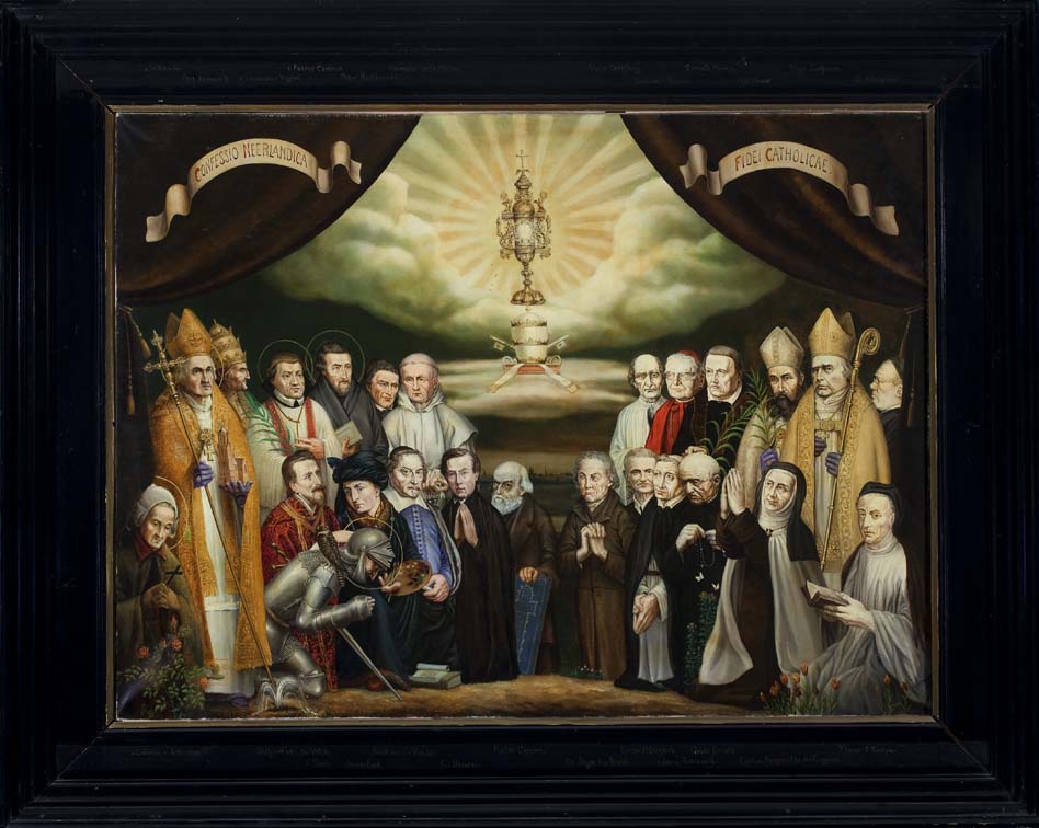 Serie van vier schilderijen met als thema ‘Confessio Neerlandica Fidei Catholicae’ (de Nederlandse belijdenis van het katholieke geloof), elk voorzien van emblemen van telkens twee specifiek katholieke leerstellingen: Transsubstantiatie en Primaatschap van de Paus (I), H. Misoffer en Mariaverering (onderschrift: ET MATER DEI MATER MEI) (II), Zeven Sacramenten en Drievoudig Priesterambt (III), Biecht en Vagevuur ...