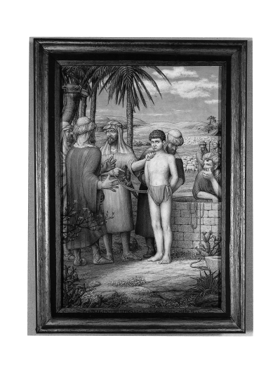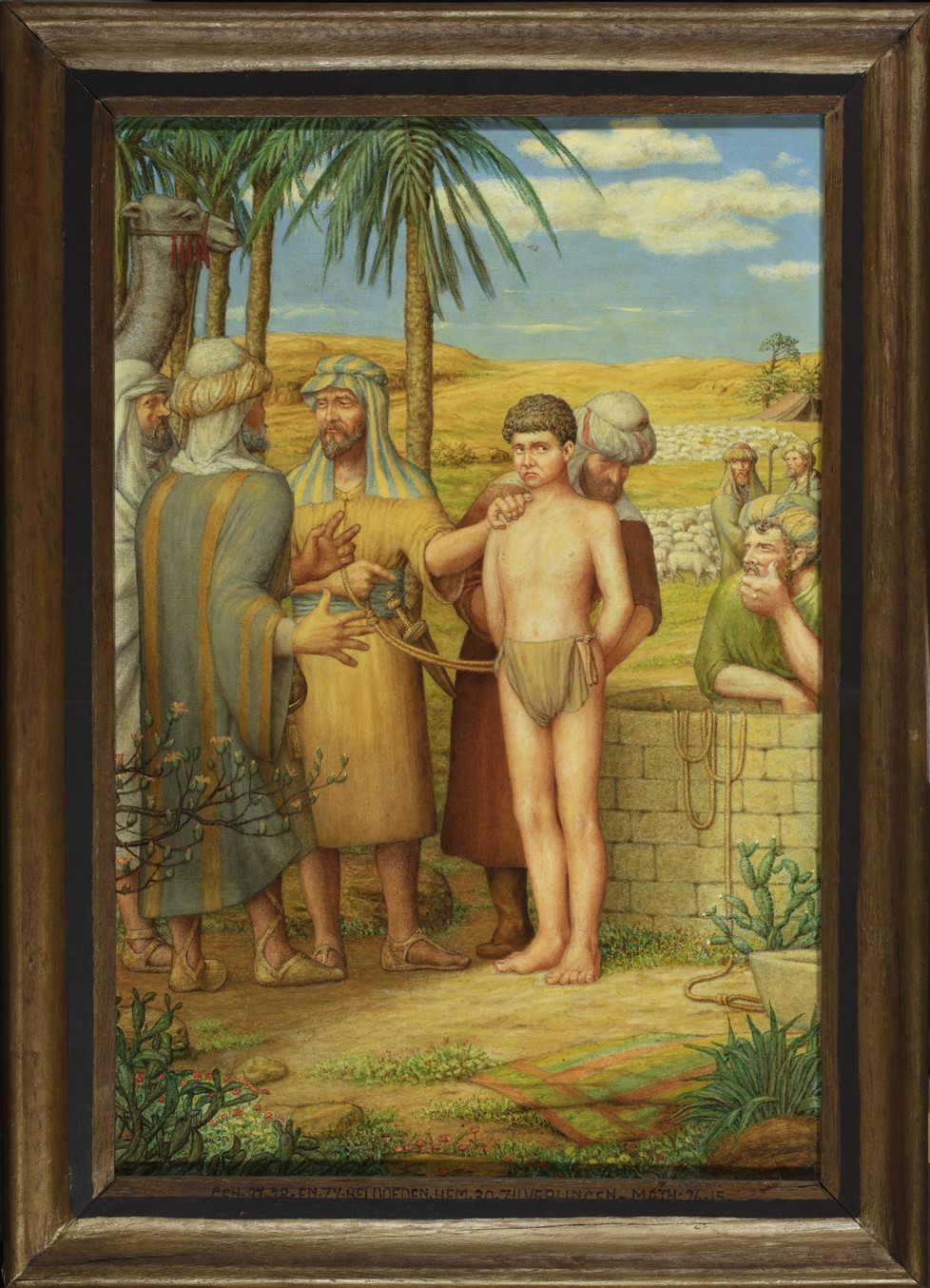 Gemonogrammeerd rechtsonder: AB (ineen). Op de onderzijde van de lijst de tekst: GEN.37.28.EN.ZIJ.BELOOFDEN.HEM.30.ZILVERLINGEN. MATH.26.15.