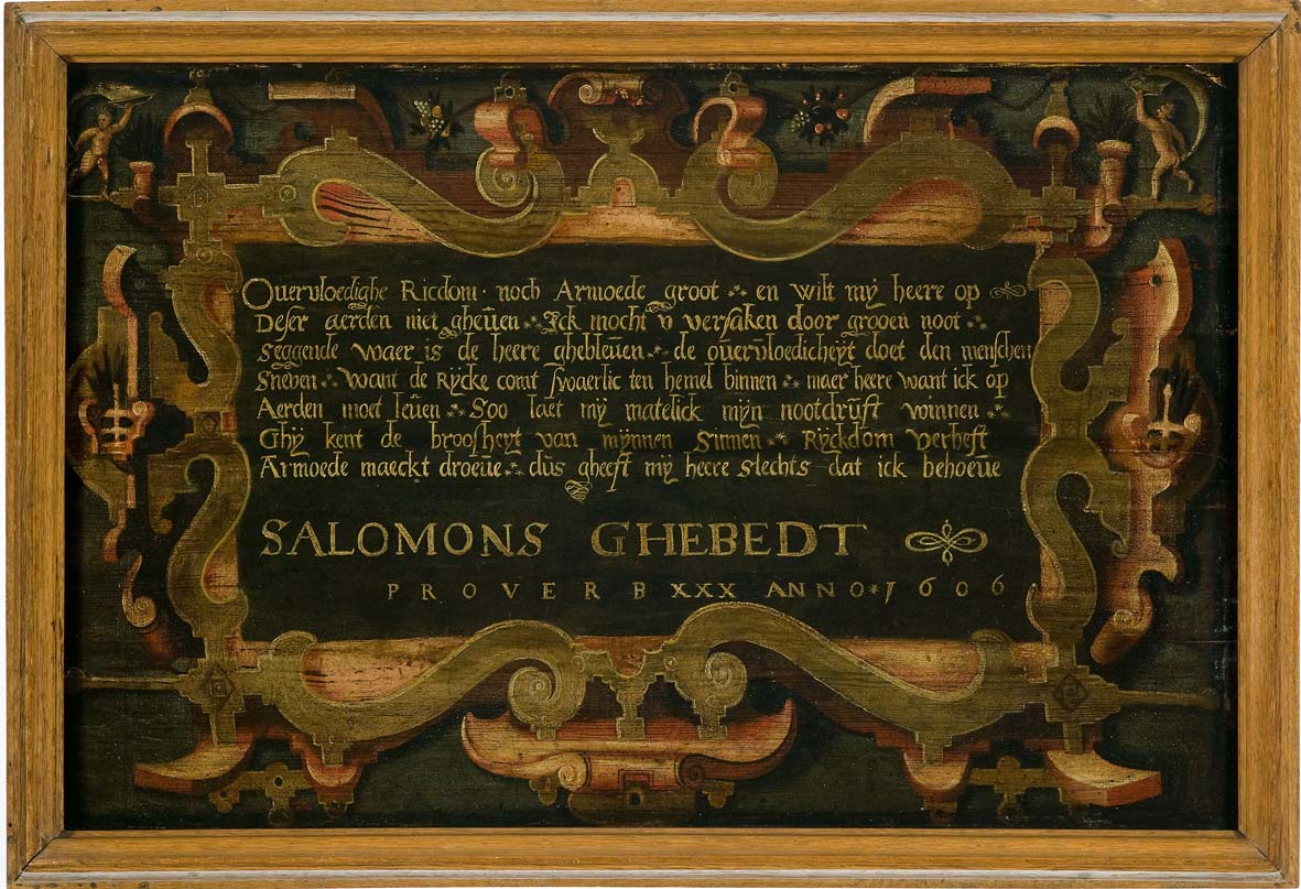 De tekst binnen de geschilderde cartouche luidt als volgt: Overvloedighe Ricdom noch Armoede groot *** en wilt mij heere op / Deser aerden niet gheven*** Ick mocht u versaken door grooen noot*** / seggende waer is de heere ghebleven*** de overvloedicheijt doet den menschen / Sneven*** want de Rijcke comt swaerlic ten hemel binnen*** maer ...