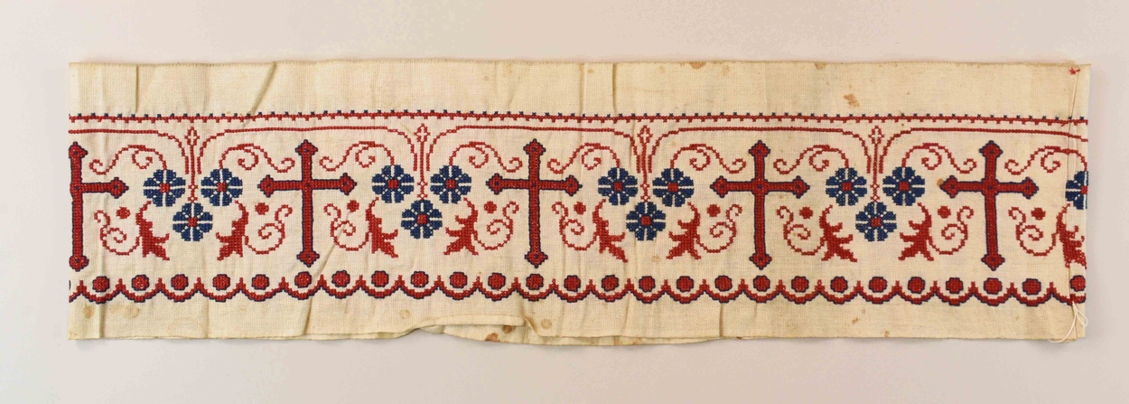 Rand van superplie geborduurd met o.a. blauwe bloemen en rode kruisen, rond lopend