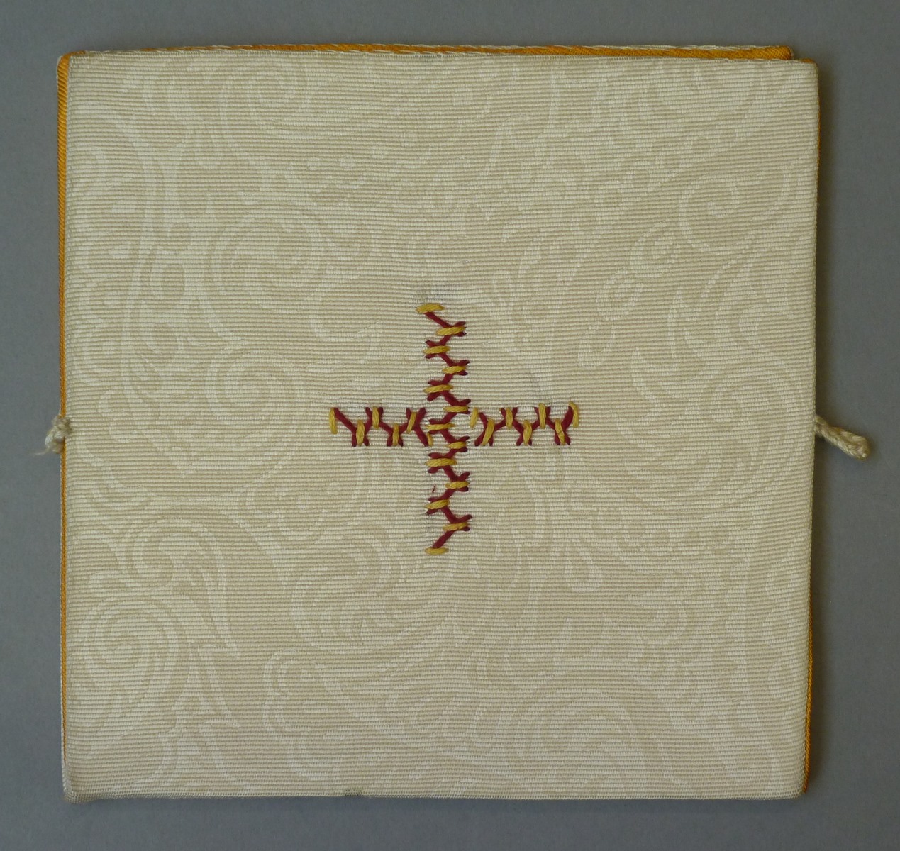 Crème speelgoedbeurs met ingeweven patroon en geborduurd rood-geel kruis