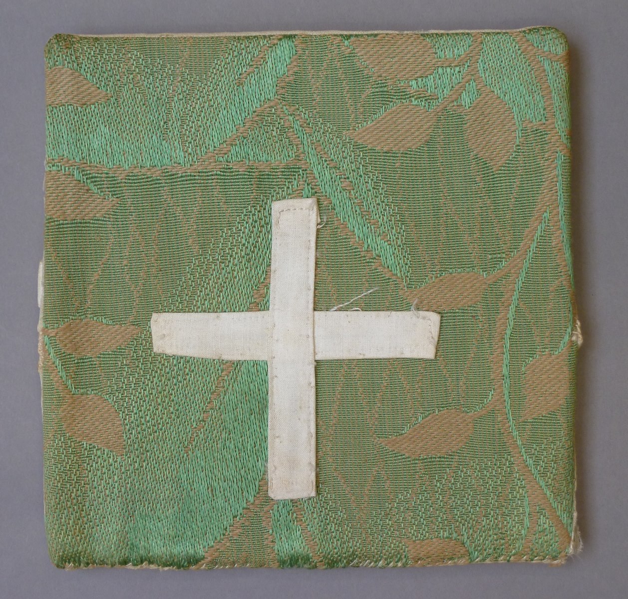 Groene speelgoedbeurs met ingeweven bruine bladertakken en opgenaaid wit kruis
