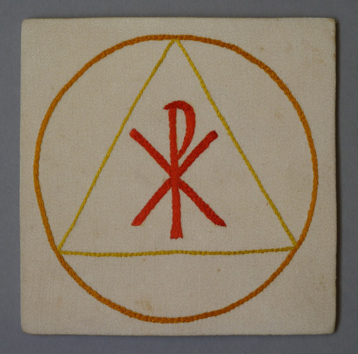 Witte speelgoedpalla met geborduurde cirkel, driehoek en rood Christusmonogram
