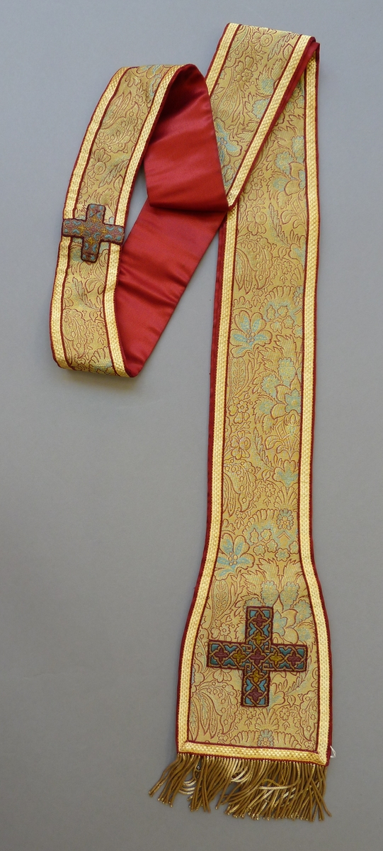 Goudkleurige stola met bloemmotieven in blauw en drie geappliceerde kruisen