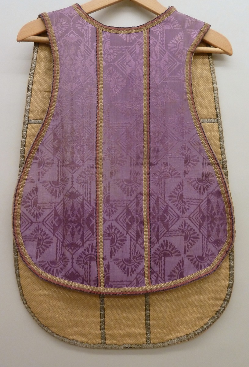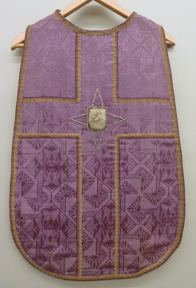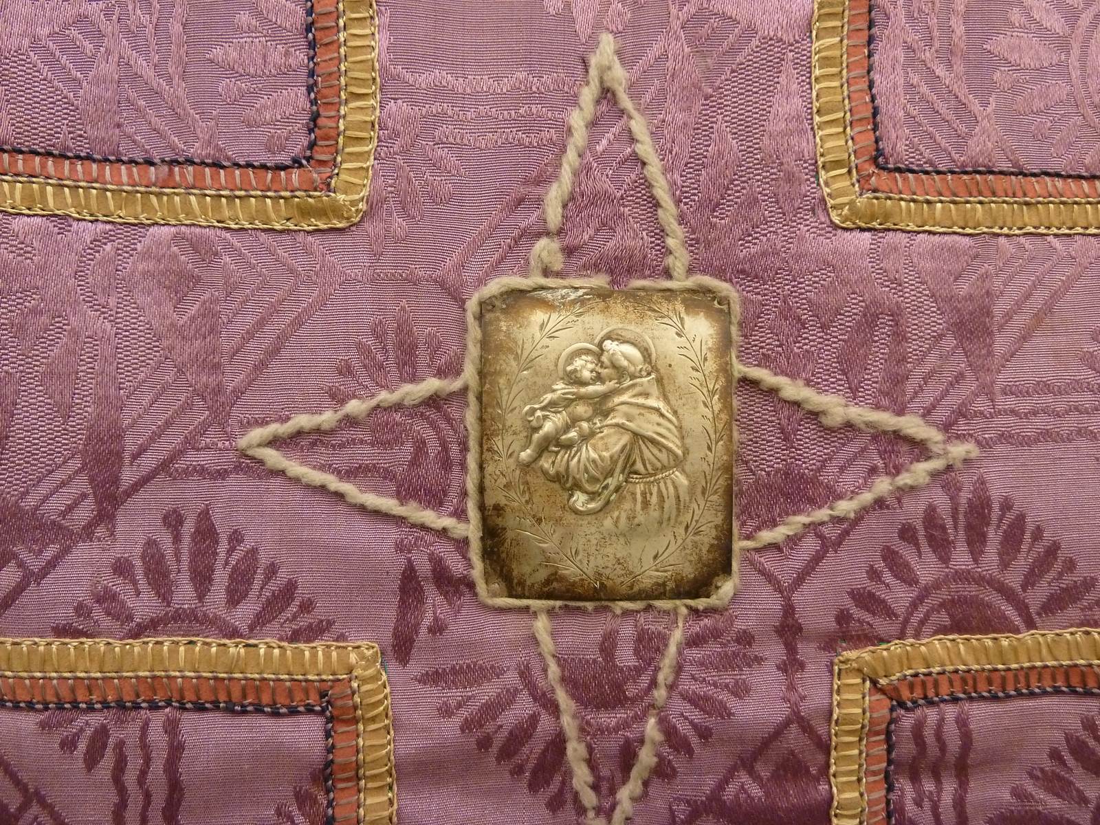 Paarsgrijs kinderkazuifel met metalen plaquette waarop H. Antonius van Padua