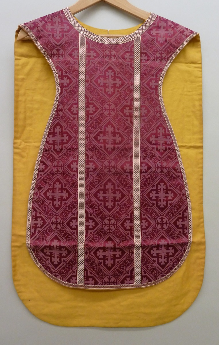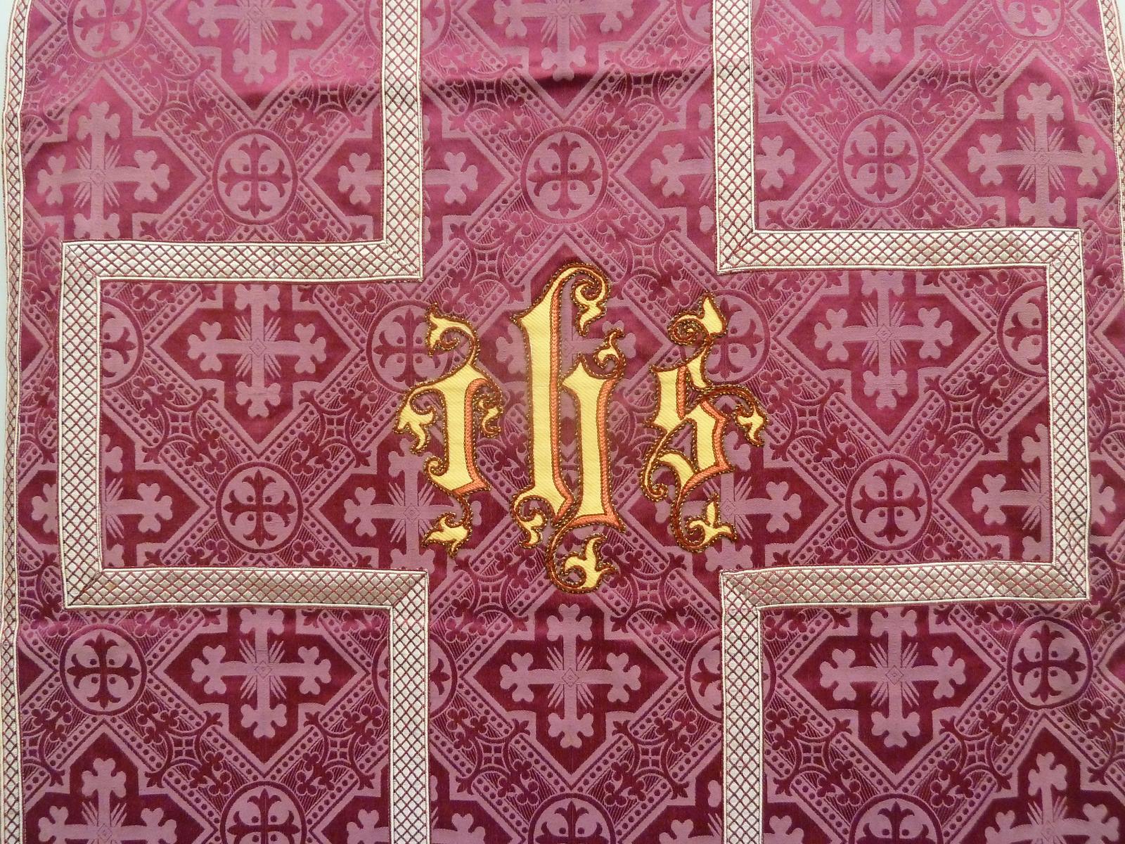 Paars kinderkazuifel met kruismotieven en IHS in geel en oranje