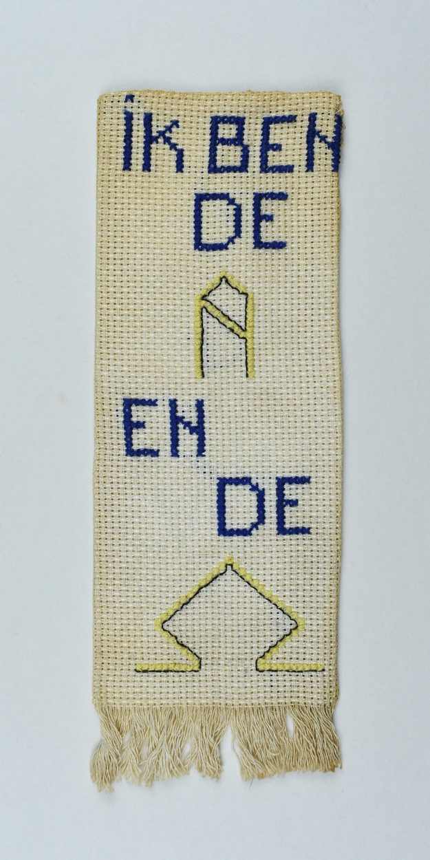 Bladwijzer geborduurd met alfa en omega en "Ik ben de ... en de ..."
