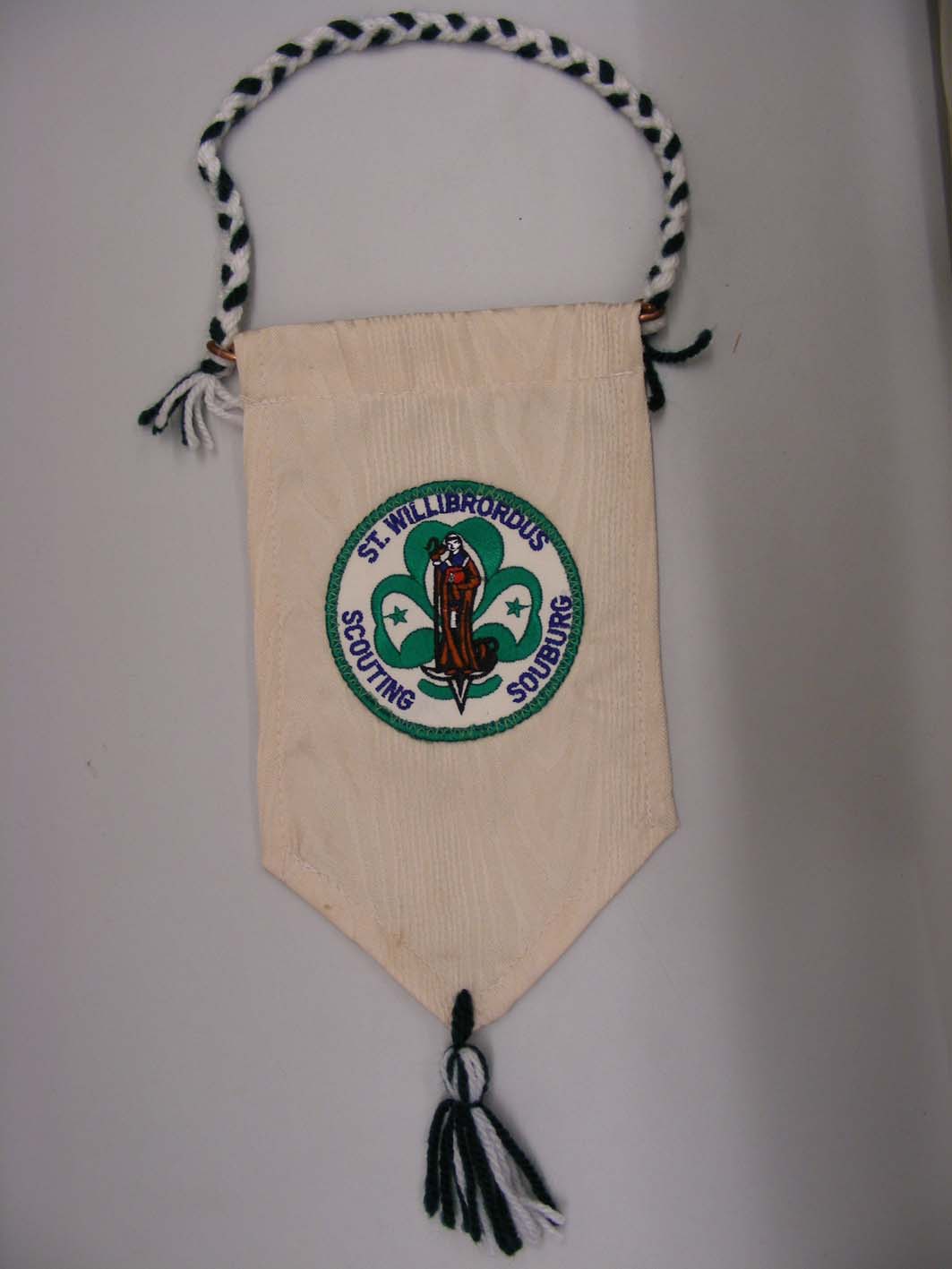 Crème vaantje met geappliceerd embleem van Scoutinggroep St. Willibrordus te Souburg