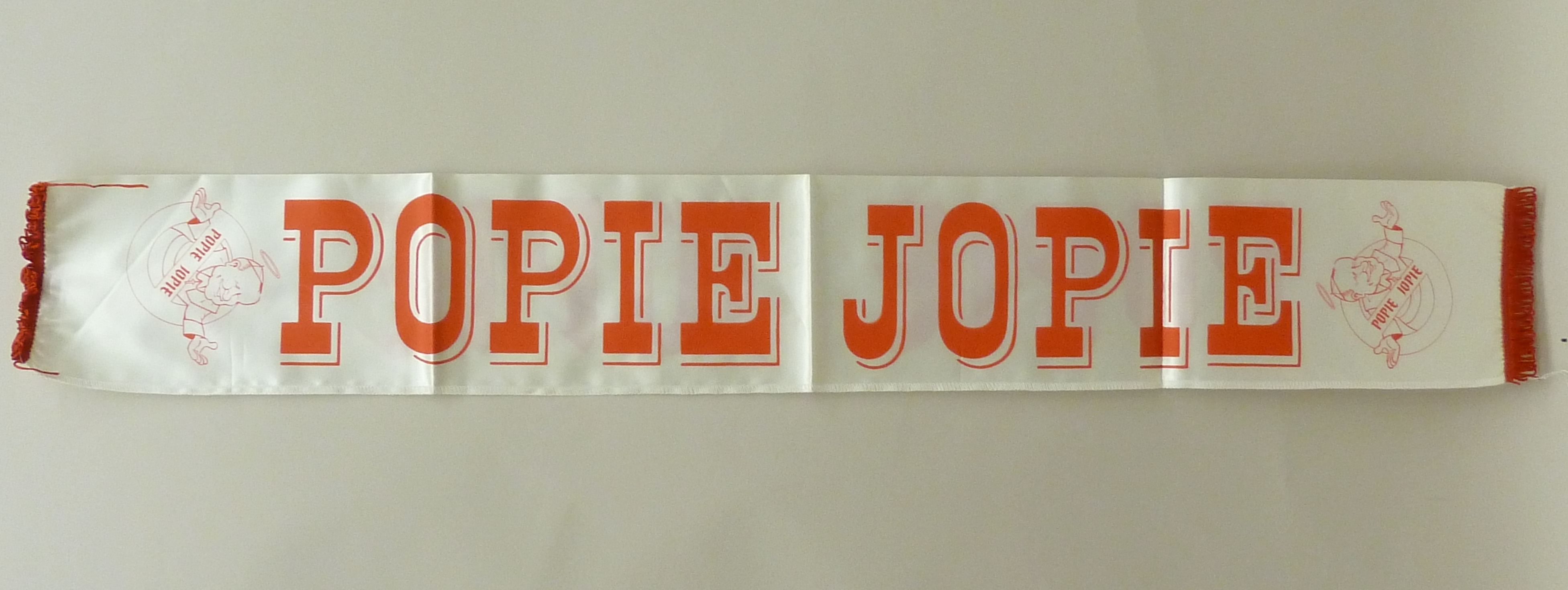 Witte sjaal met in rode letters "Popie Jopie" en twee karikaturen van paus Johannes Paulus II