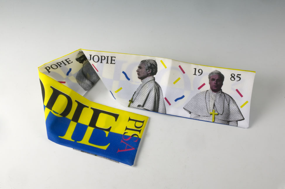 Meerkleurige sjaal met "Anno Popie Jopie 1985" en Henk Spaan als paus, achterkant met "Vara ... Pisa"