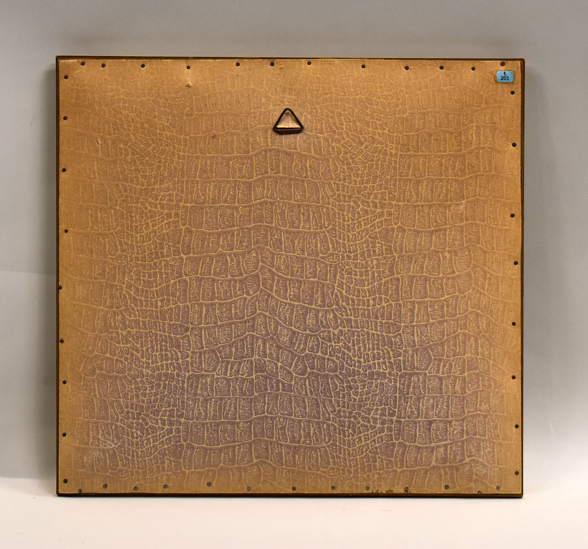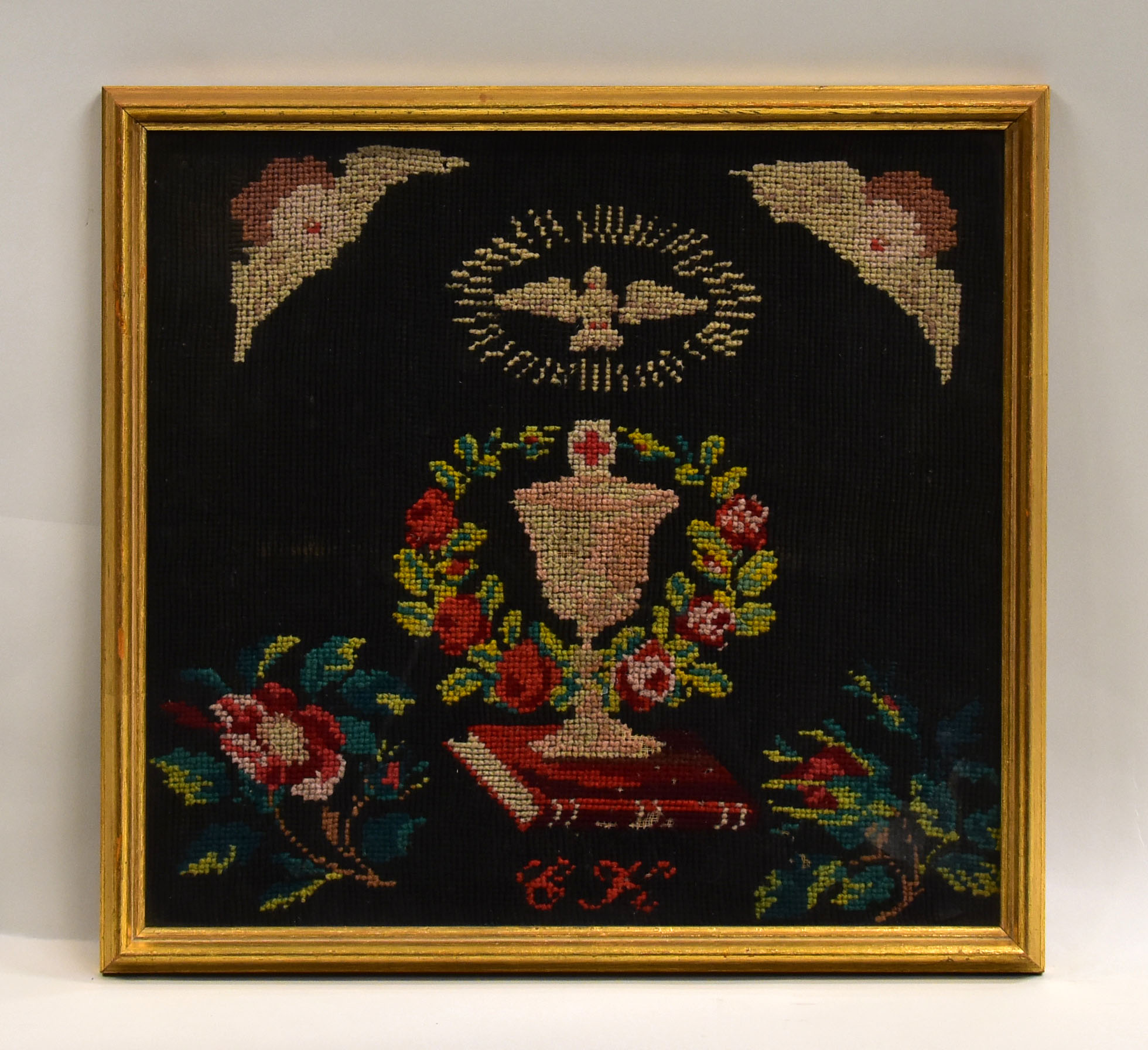 Merklap geborduurd met kelk op boek, H. Geest, rozen en cherubkopjes op zwart fond