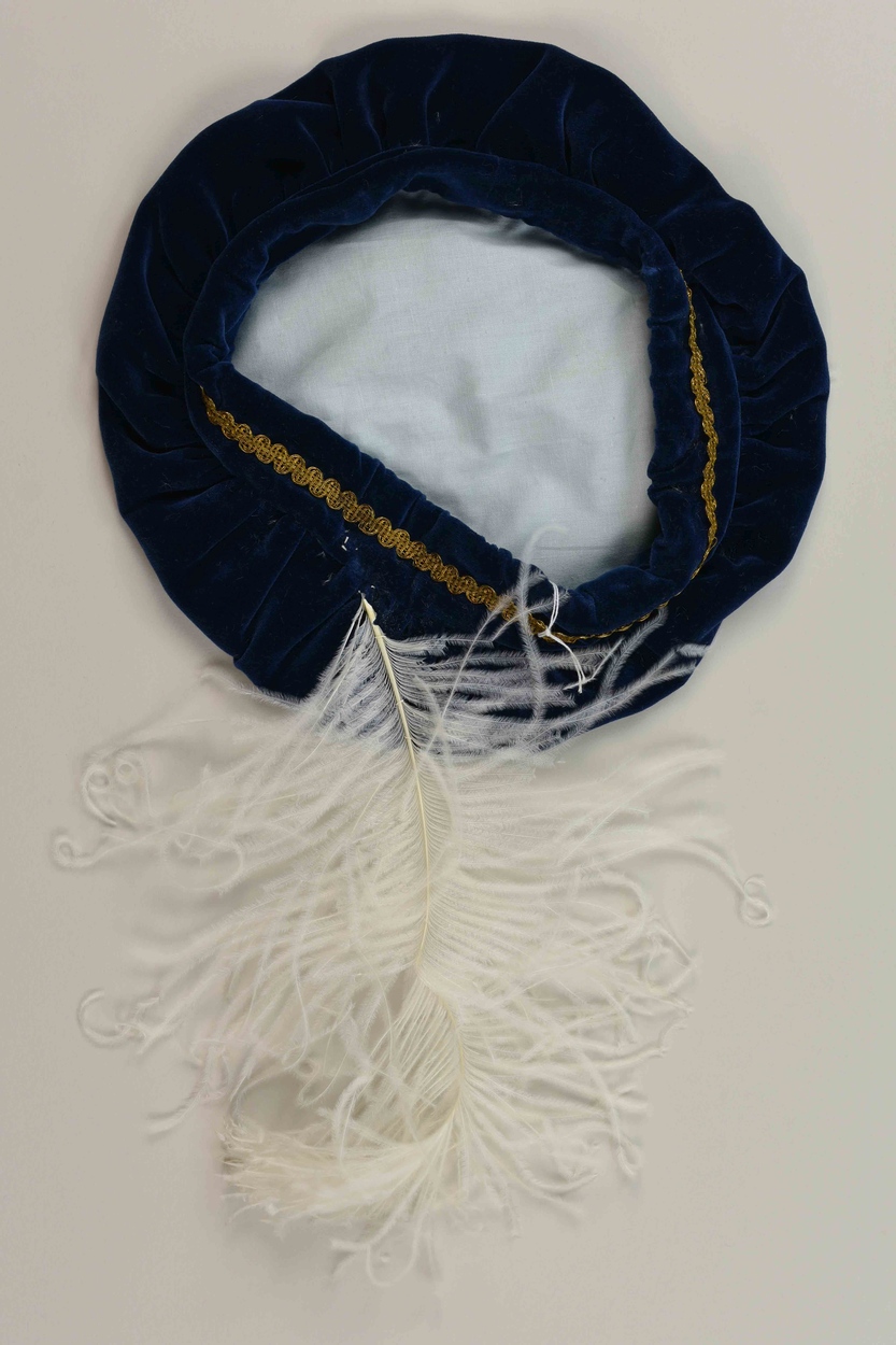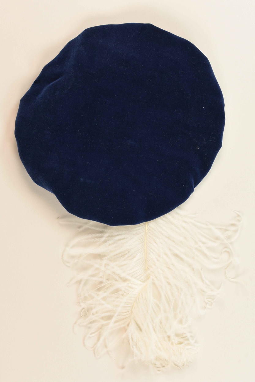 Blauwe baret met struisvogelveer, afgezet met smalle band goudgalon