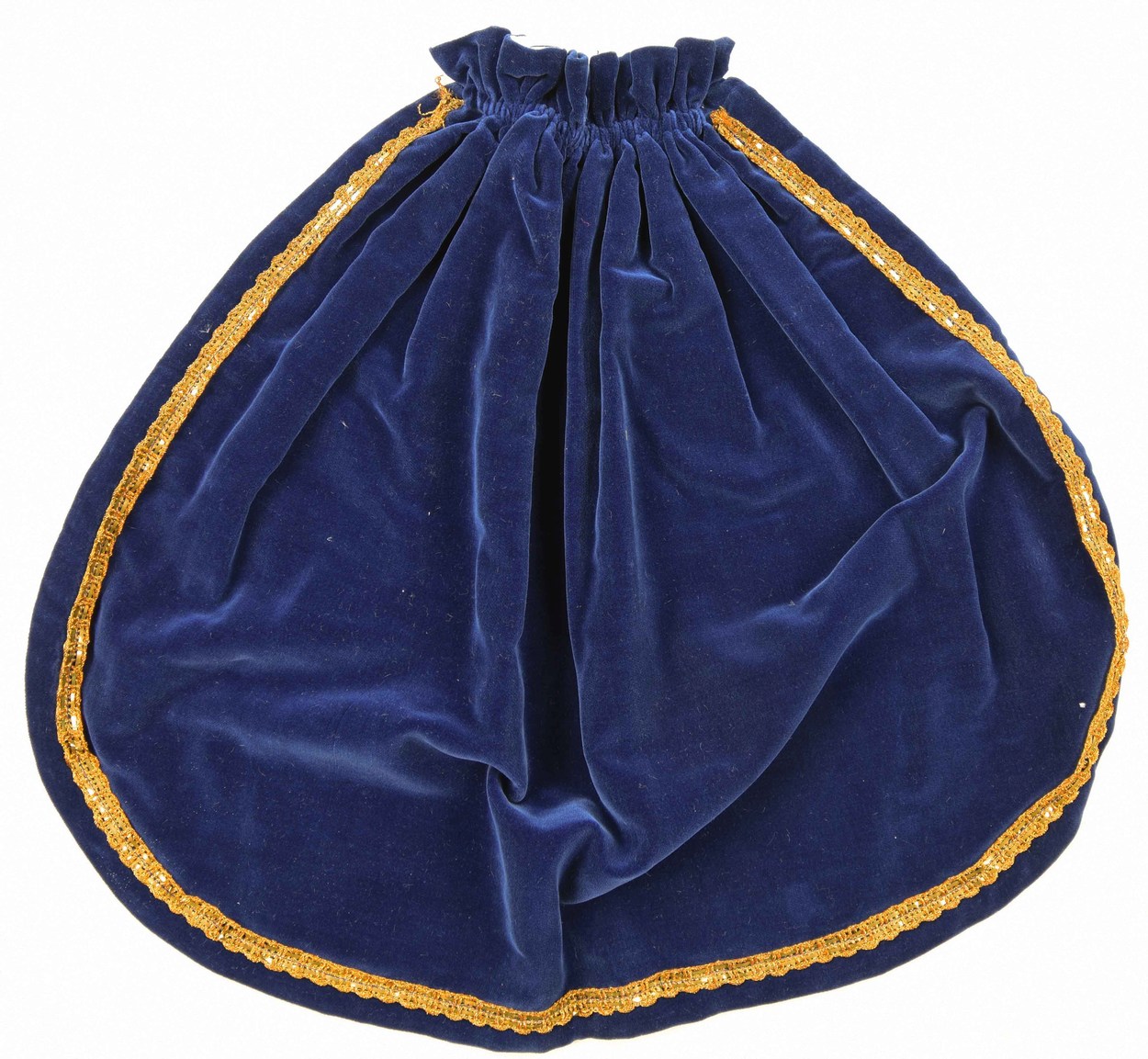 Blauwe schoudermantel afgezet met band goudgalon