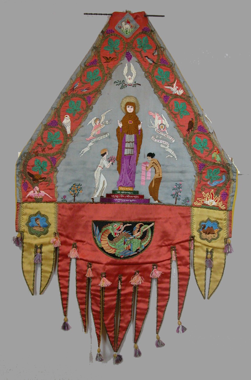 Vaandeltje van St. Melania met dierensymboliek en Nederlandse en Javaanse tekst