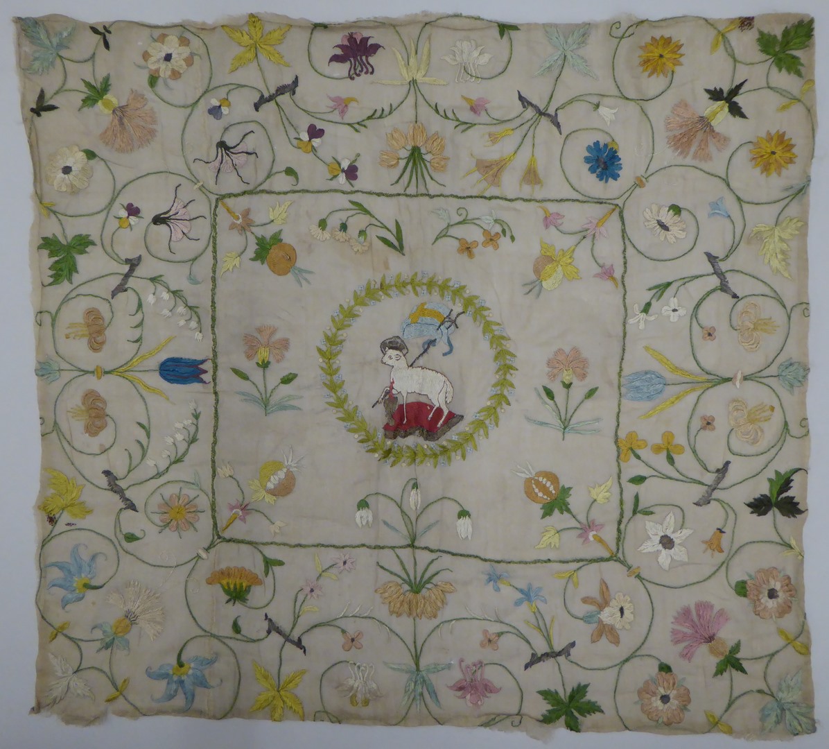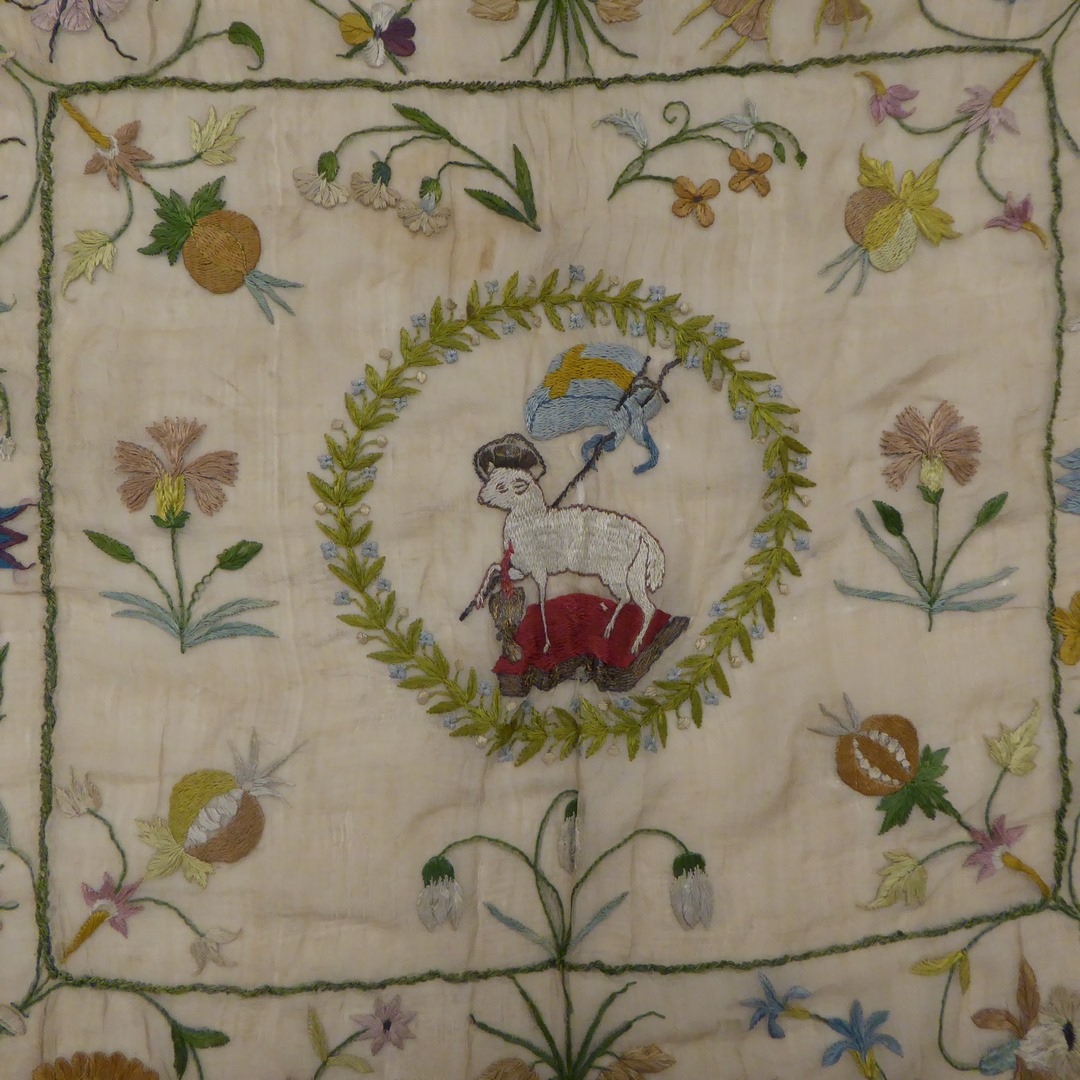 Fragment van kelkvelum met Lam Gods met kruisvaan en bloedend hart, omgeven door florale motieven