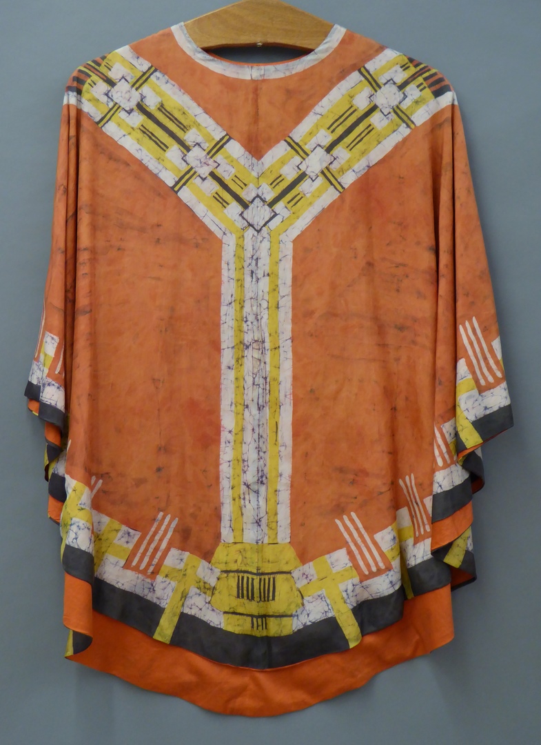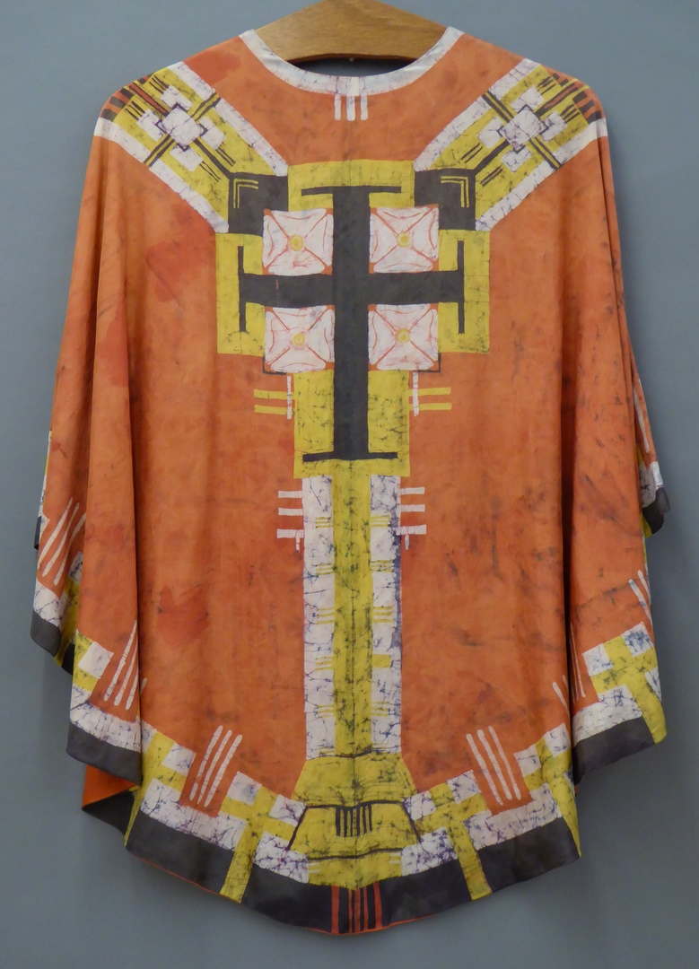 Oranje kazuifel met kruis op achterzijde, gebatikt in oranje, wit, geel en bruin