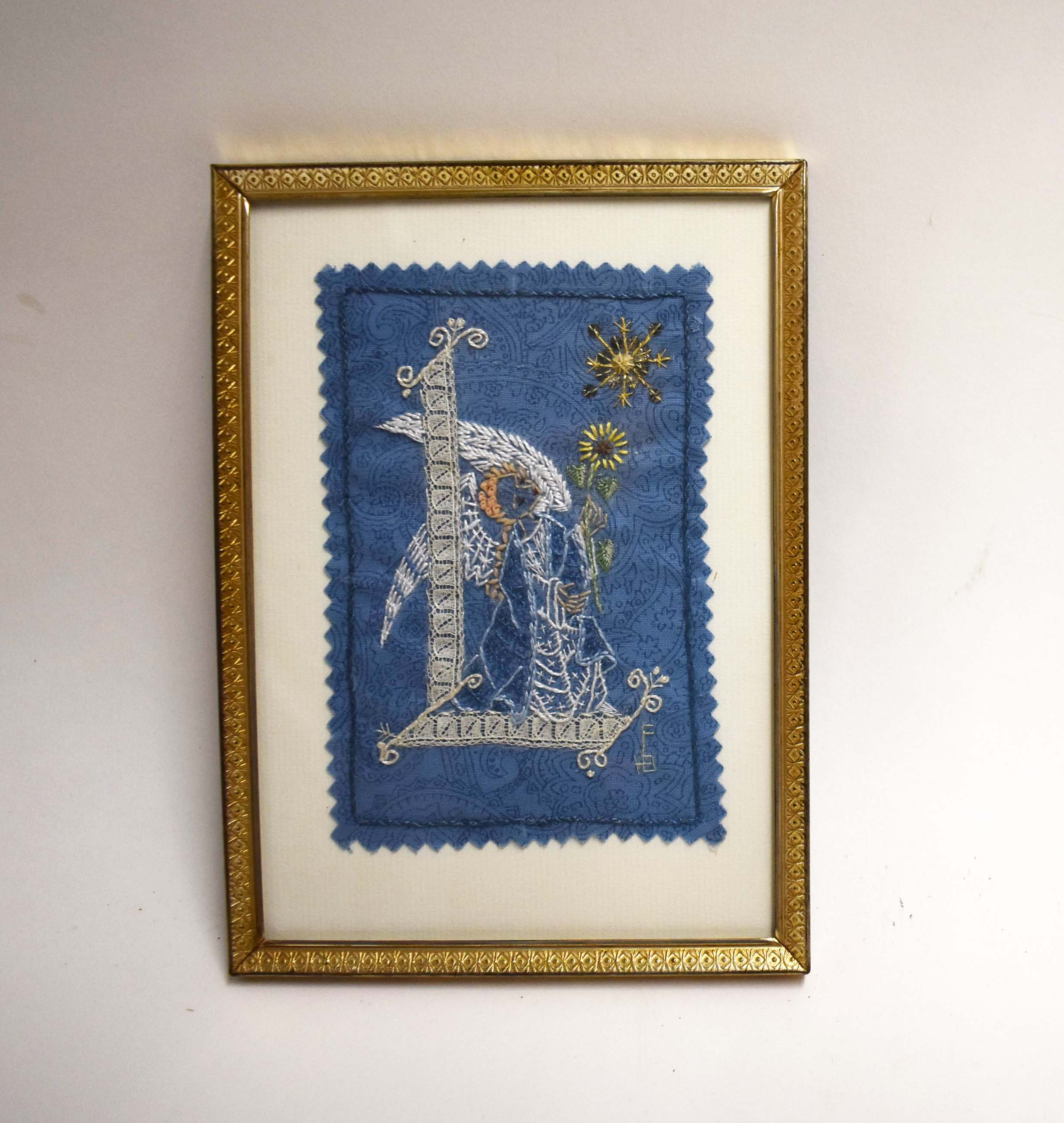 Geborduurde hoofdletter L waarop engel met zonnebloem, bij kerstkaart