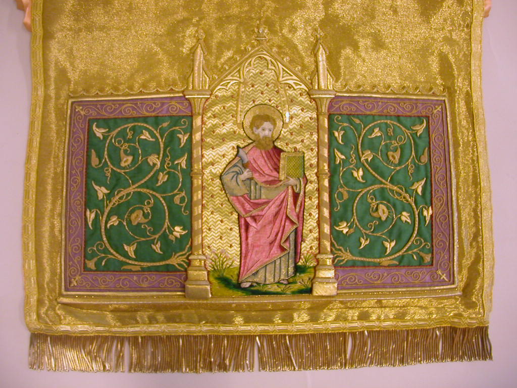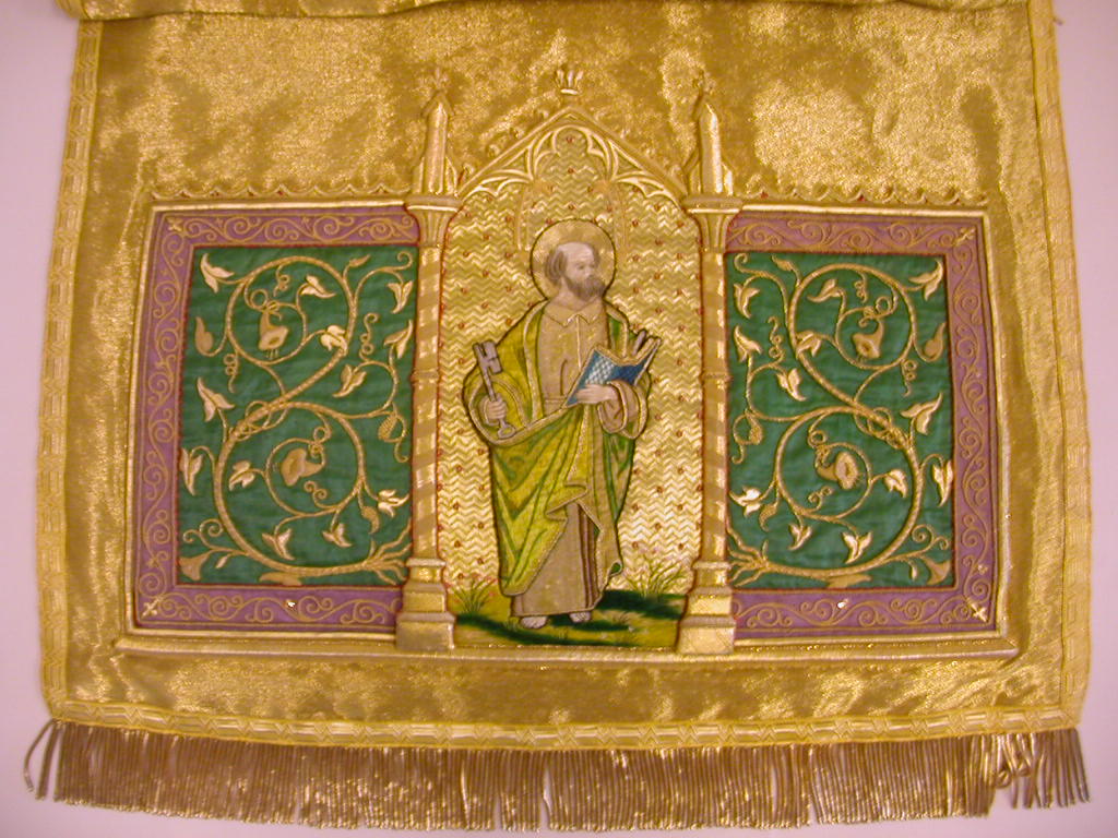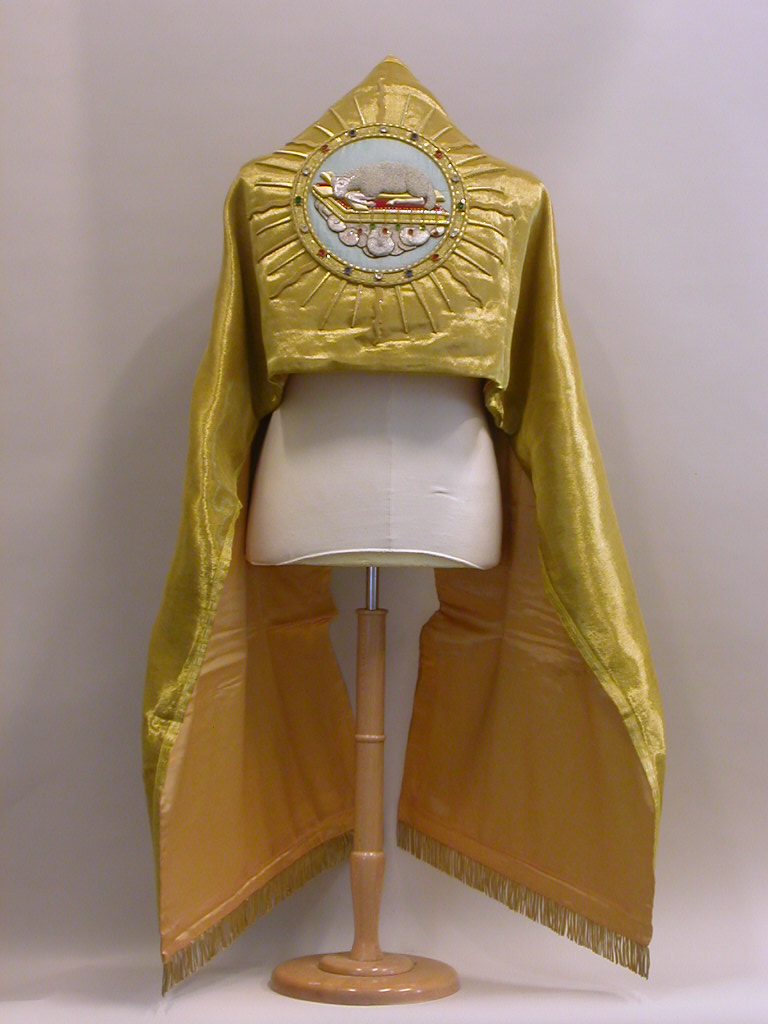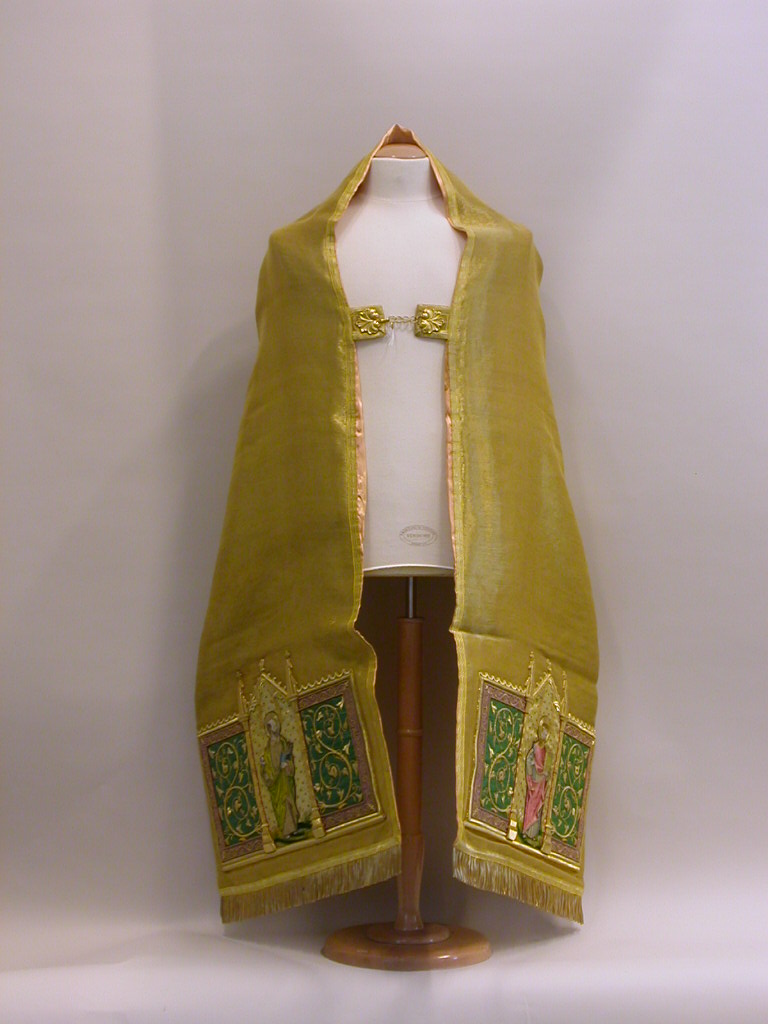 Goudkleurige schoudervelum met Lam Gods met Petrus en Paulus(?) met klein zwaardje