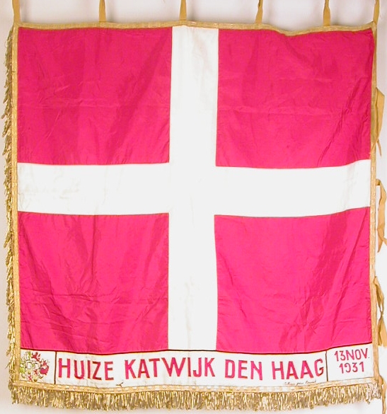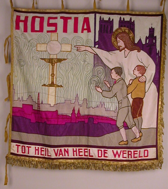 Hostiavlag met Jezus en twee jongens "tot heil van heel de wereld", achterzijde rood met wit kruis en met "Huize Katwijk Den Haag 13 nov 1931"