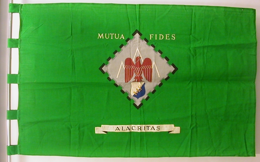 Groene vlag met "Mutua Fides", grijs vlak met adelaar en wapenschild en met "Alacritas"