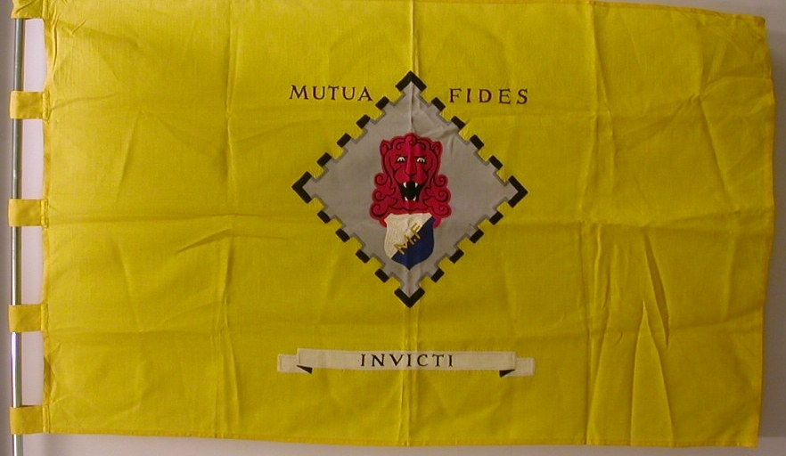 Gele vlag met "Mutua Fides", grijs vlak met rode leeuw en wapenschild en met "Invicti"
