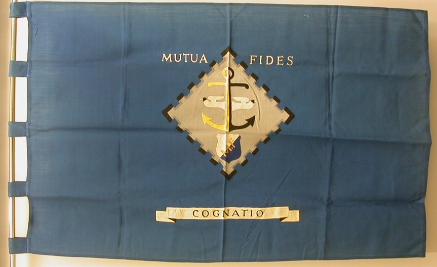 Blauwe vlag met "Mutua Fides", grijs vlak met anker en wapenschild en met "Cognatio"