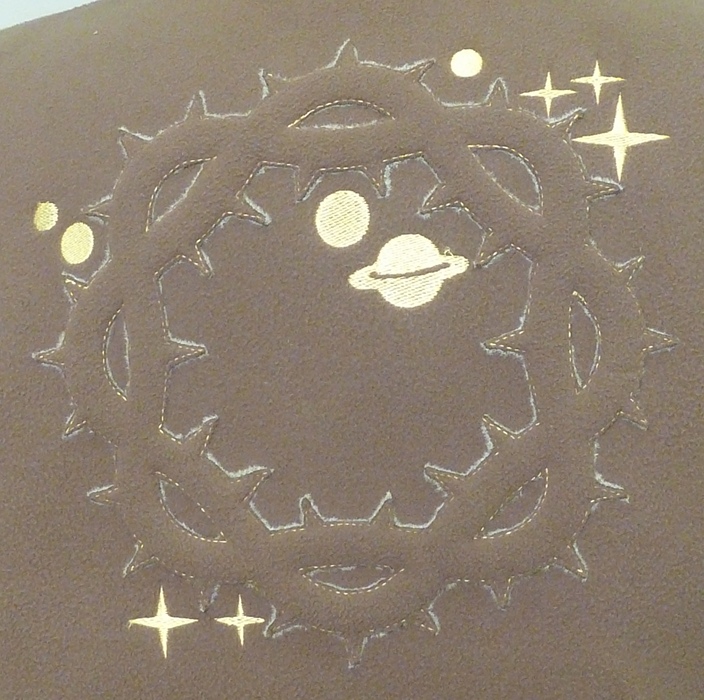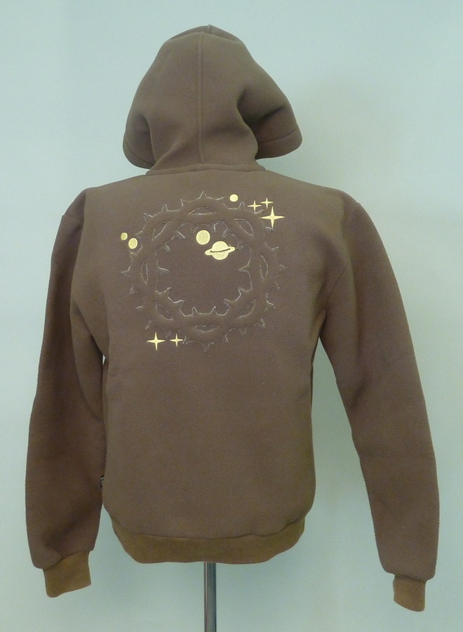 Groen vest met capuchon en geappliceerde doornenkroon en gele sterren en planeten op rug