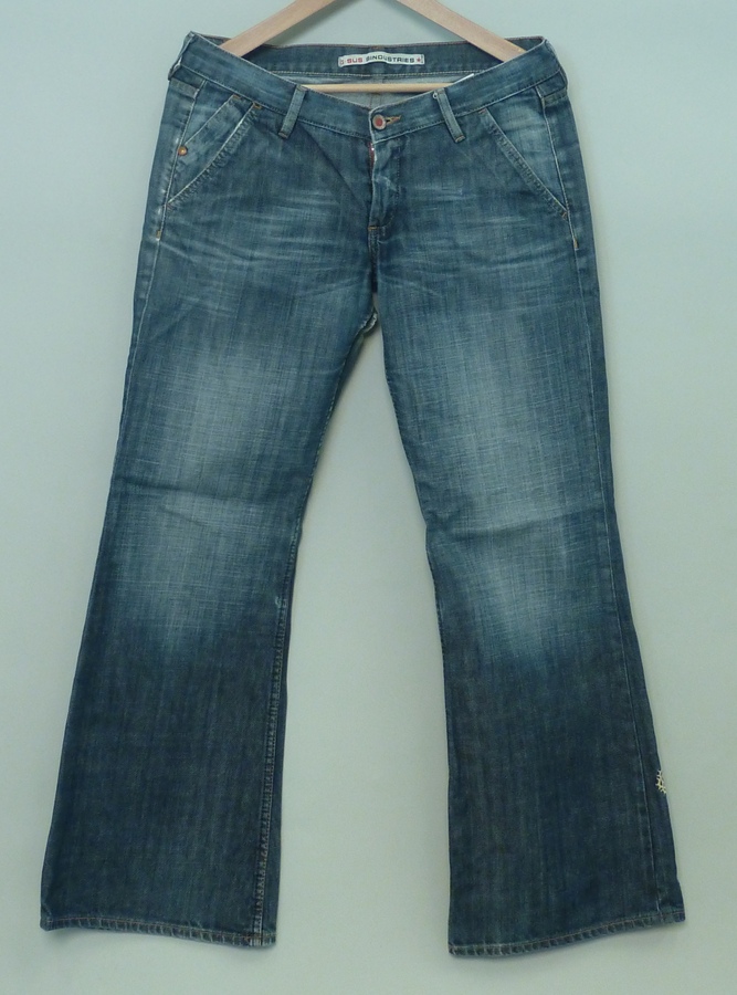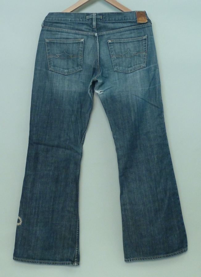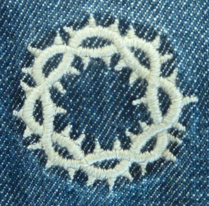 Blauwe spijkerbroek met wit geborduurd doornenkroontje onderaan linkerpijp