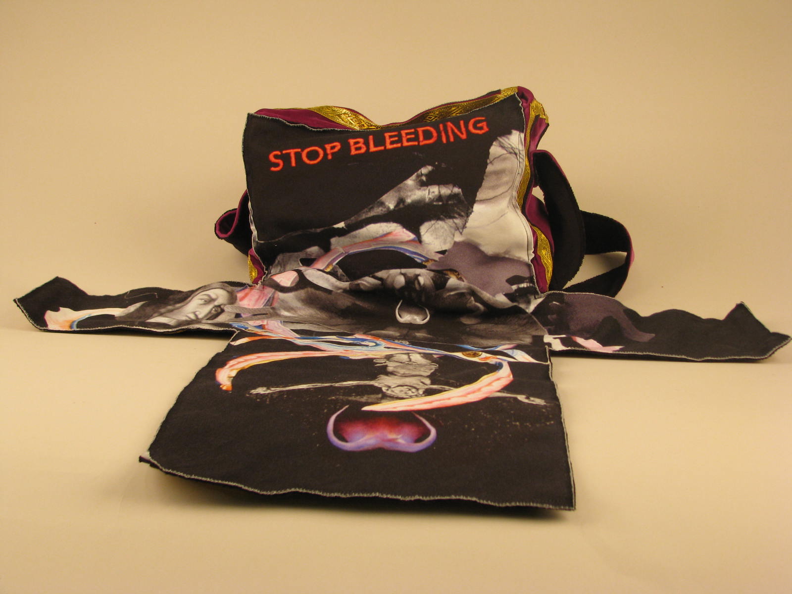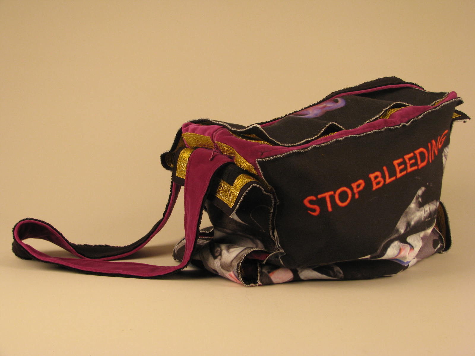 Paarse schoudertas 'Statieweg' met "stop bleeding" met zwarte buitenbekleding, losgemaakt een kruis vormend, waarop o.a. Christus