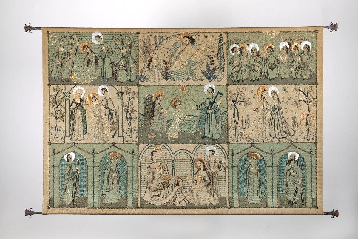 Wandkleed met H. Familie en naamheiligen van de familie Govaart-Halkes, o.a. Theodorus en Catharina van Siena