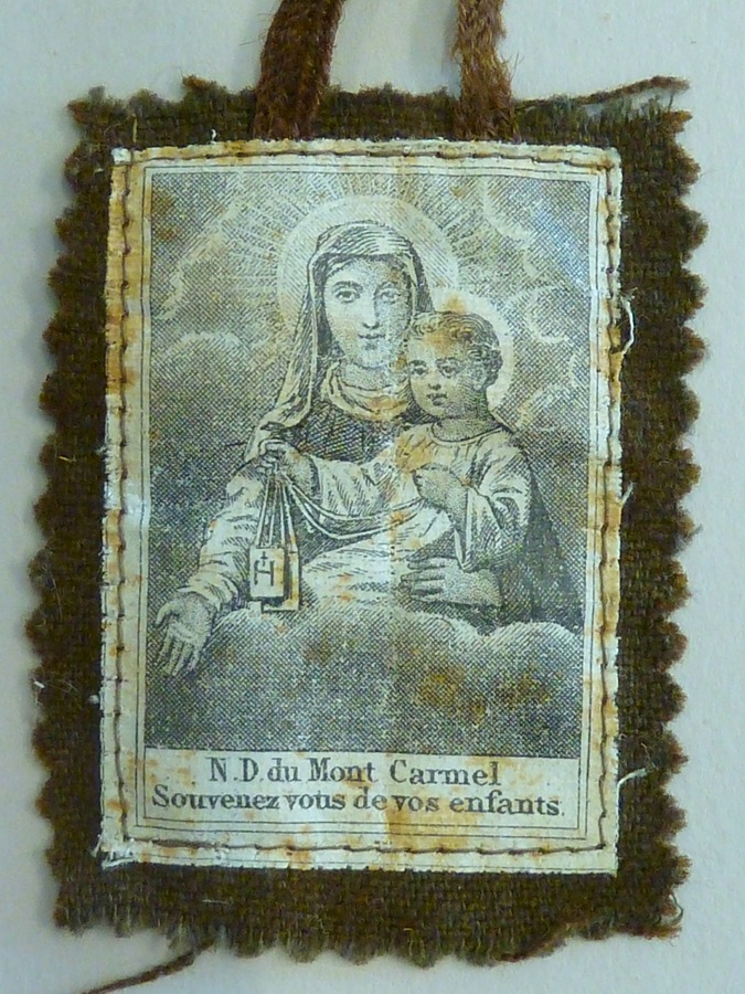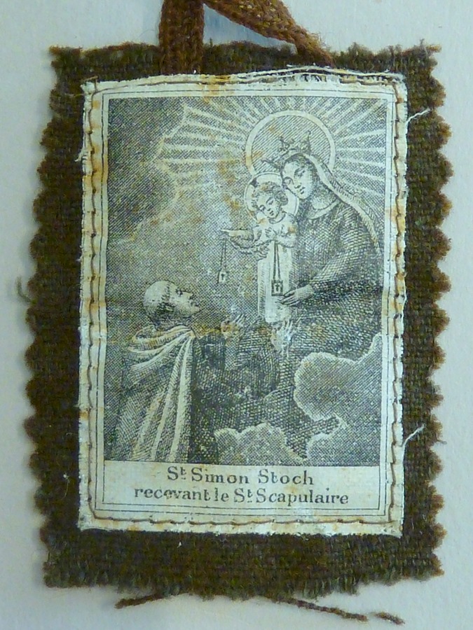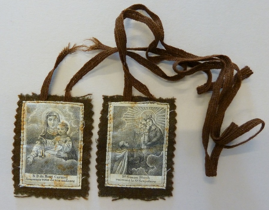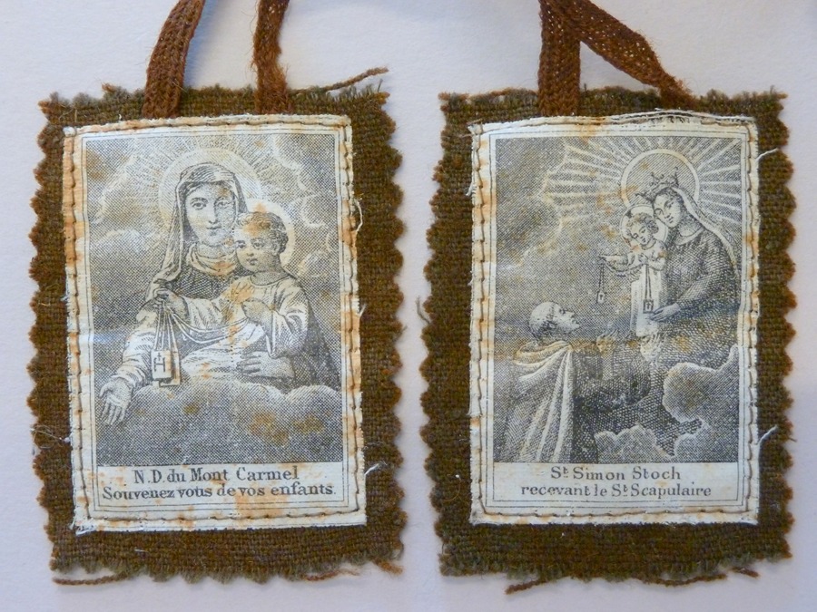 Bruine scapulier met twee afbeeldingen: 'Notre Dame du Mont Carmel, Souvenez vous de vos enfants' (Maria met kind Jezus die een scapulier vasthoudt), en 'St. Simon Stoch recevant le St. Scapulaire' (Het Kind overhandigt de scapulier aan H. Simon)