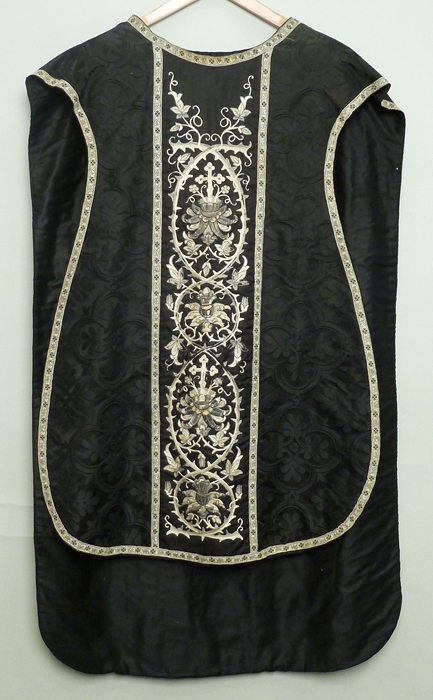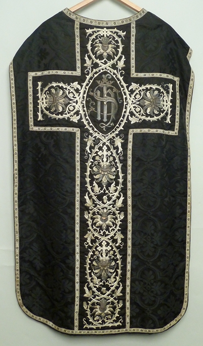 Zwart kazuifel met kruis waarin borduursel van doornenranken en IHS