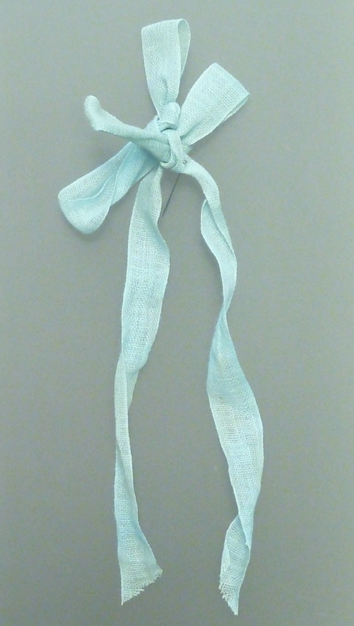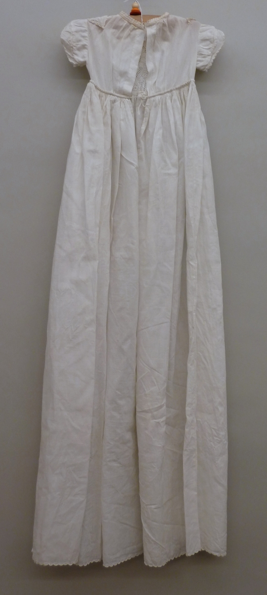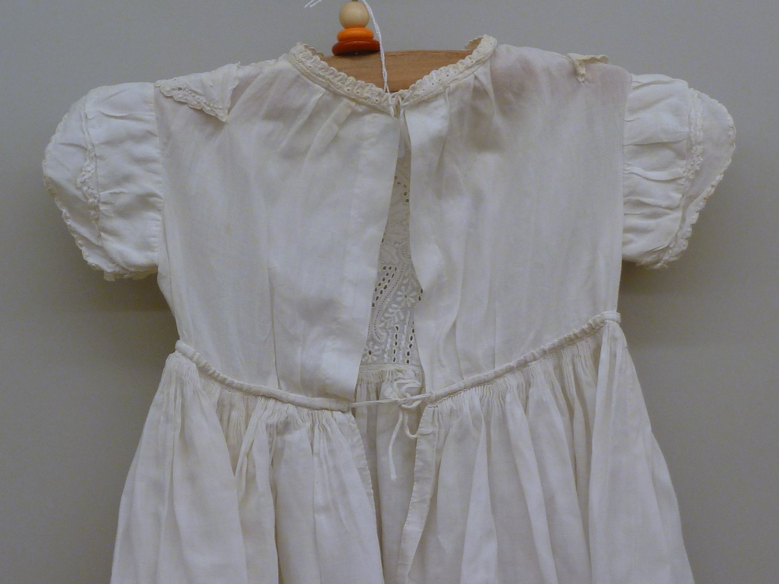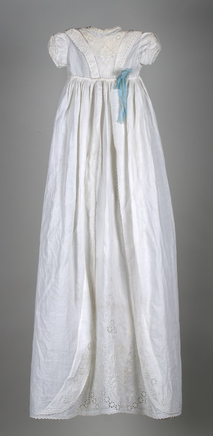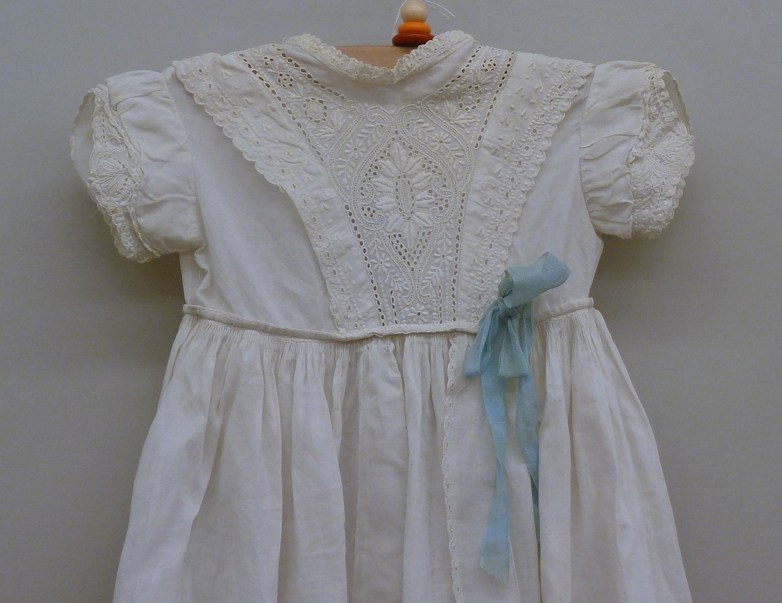 Doopjurk, middenonder en lijfje geborduurd met bloem- en bladmotieven, met opgespeld blauw strikje