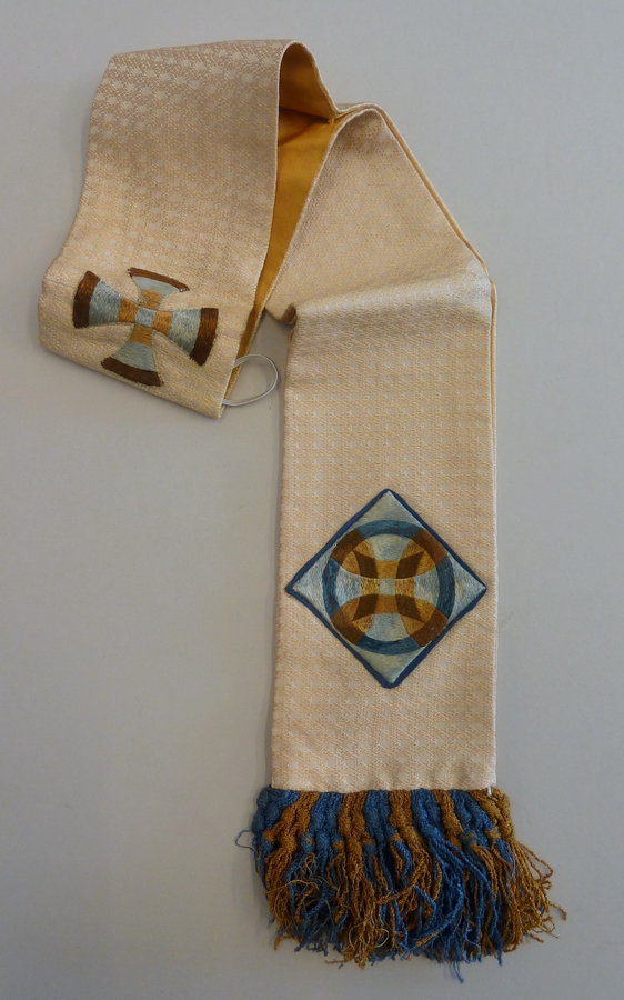 Crèmekleurige manipel met geborduurd kruis en geometrisch figuur met blauw kruis aan uiteinde