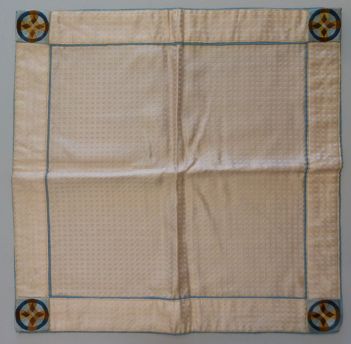 Crèmekleurige kelkvelum met op iedere hoek een geborduurd geometrisch figuur met blauw kruis