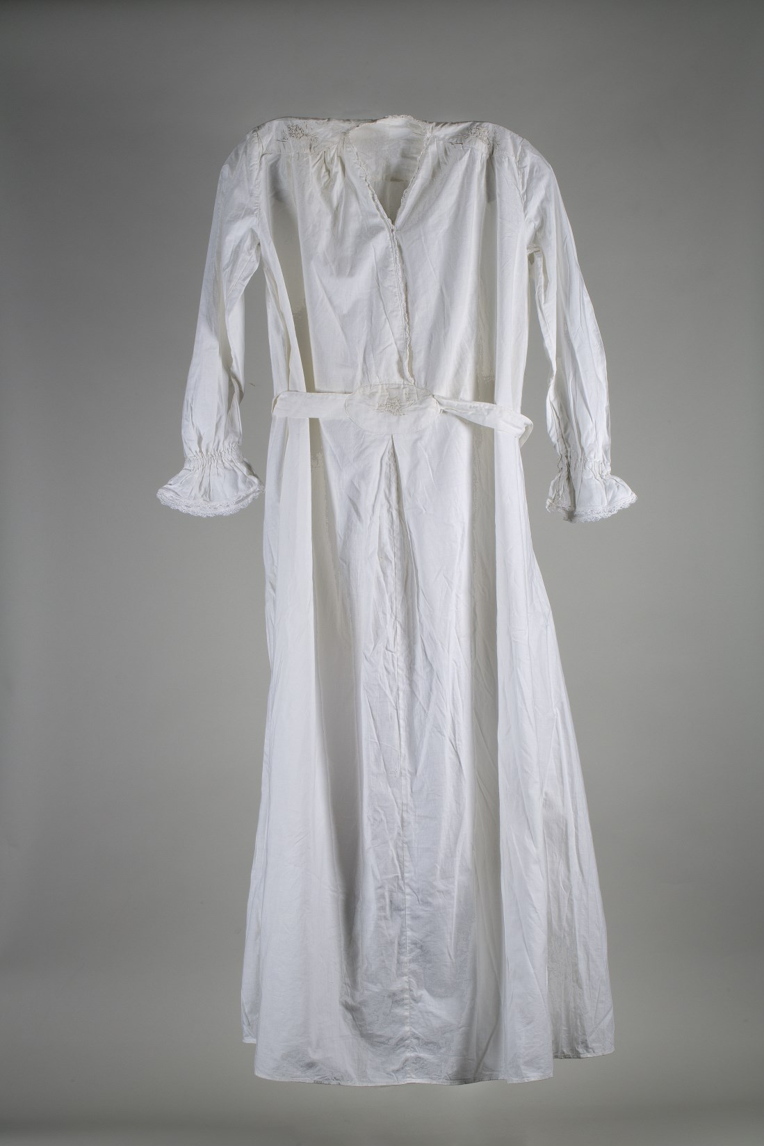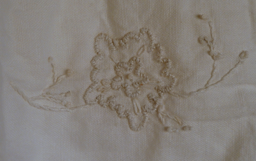 Linnen doodshemd met geborduurde bloem op schouders en buik en kantrand langs mouwen en hals
