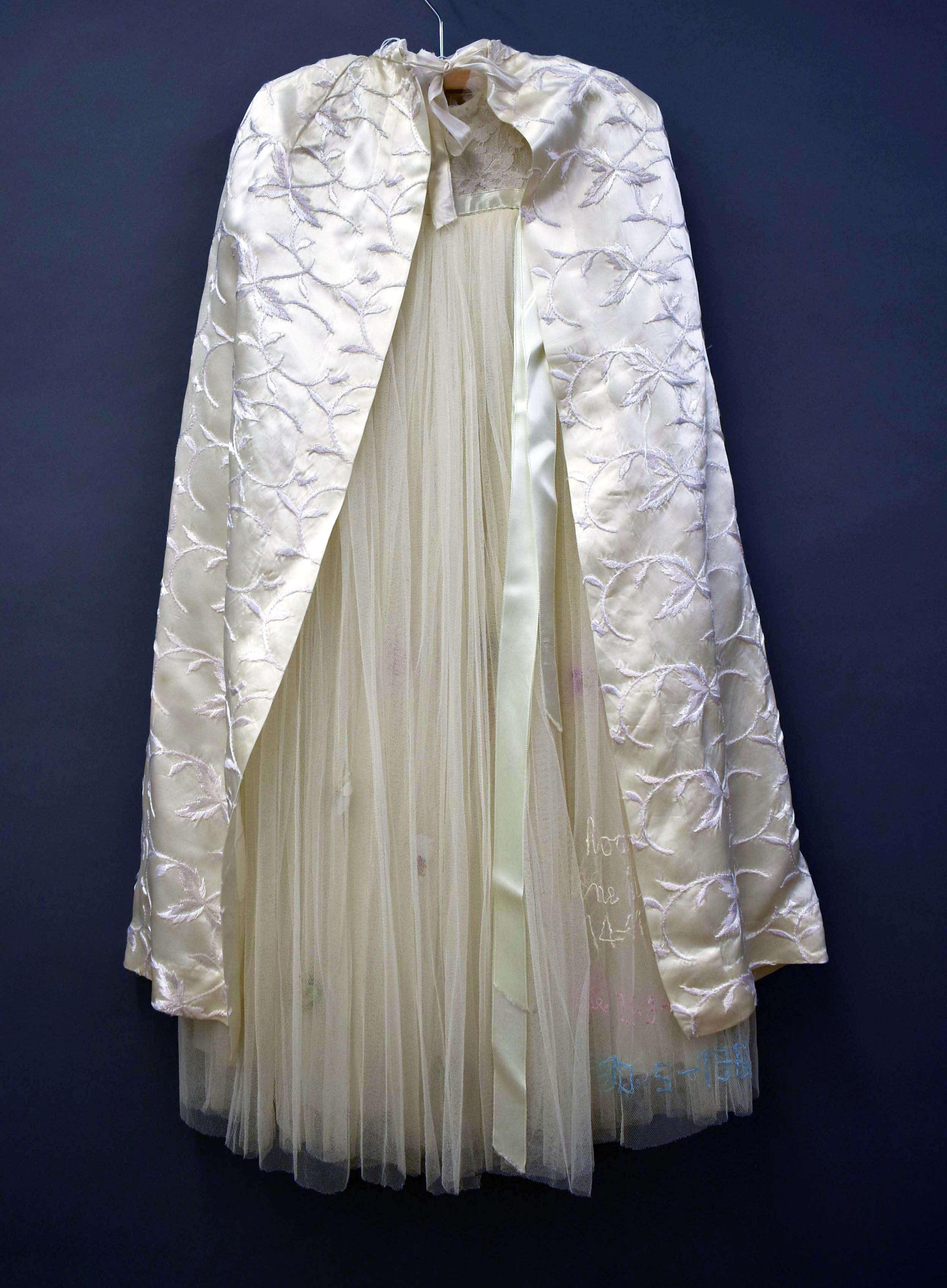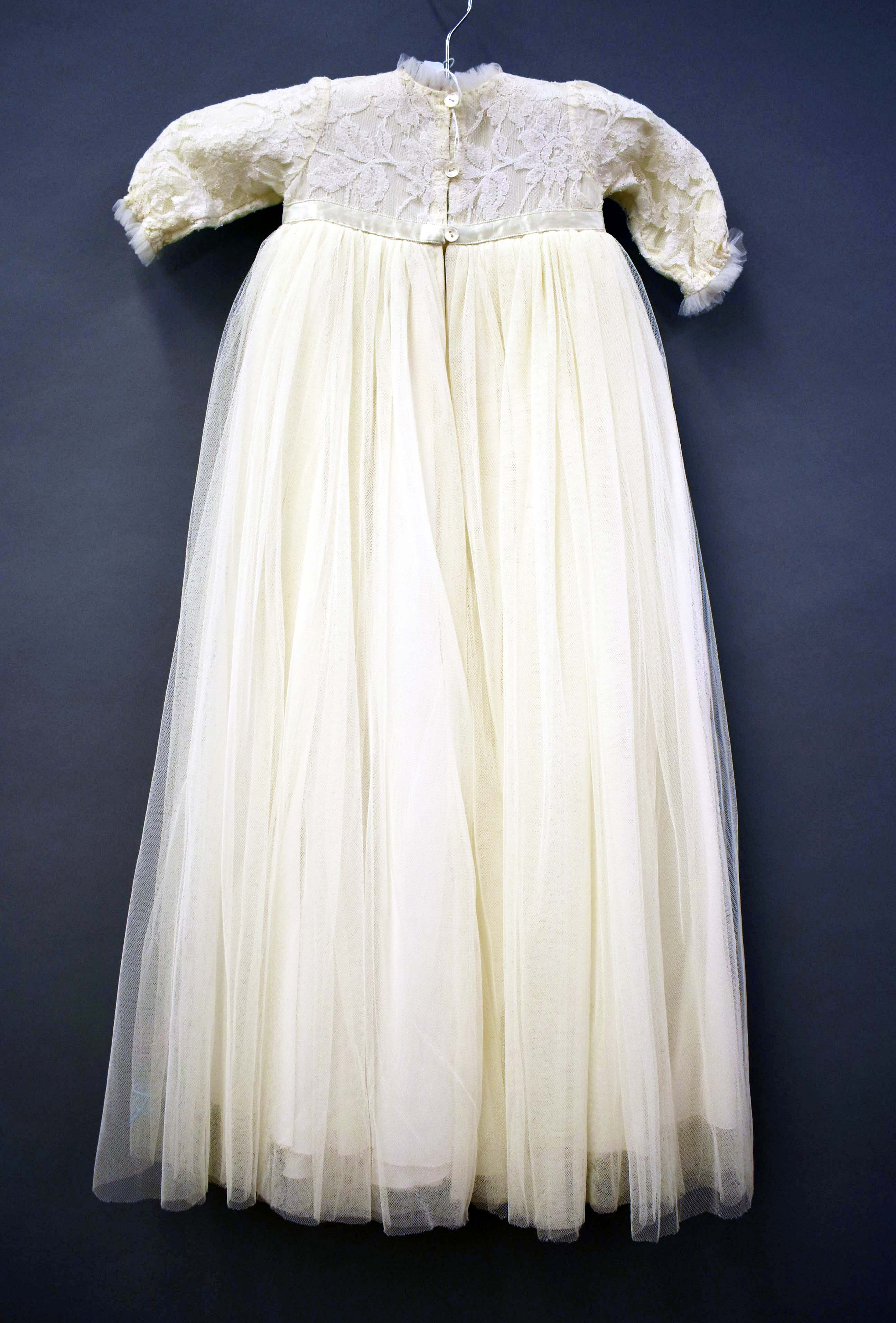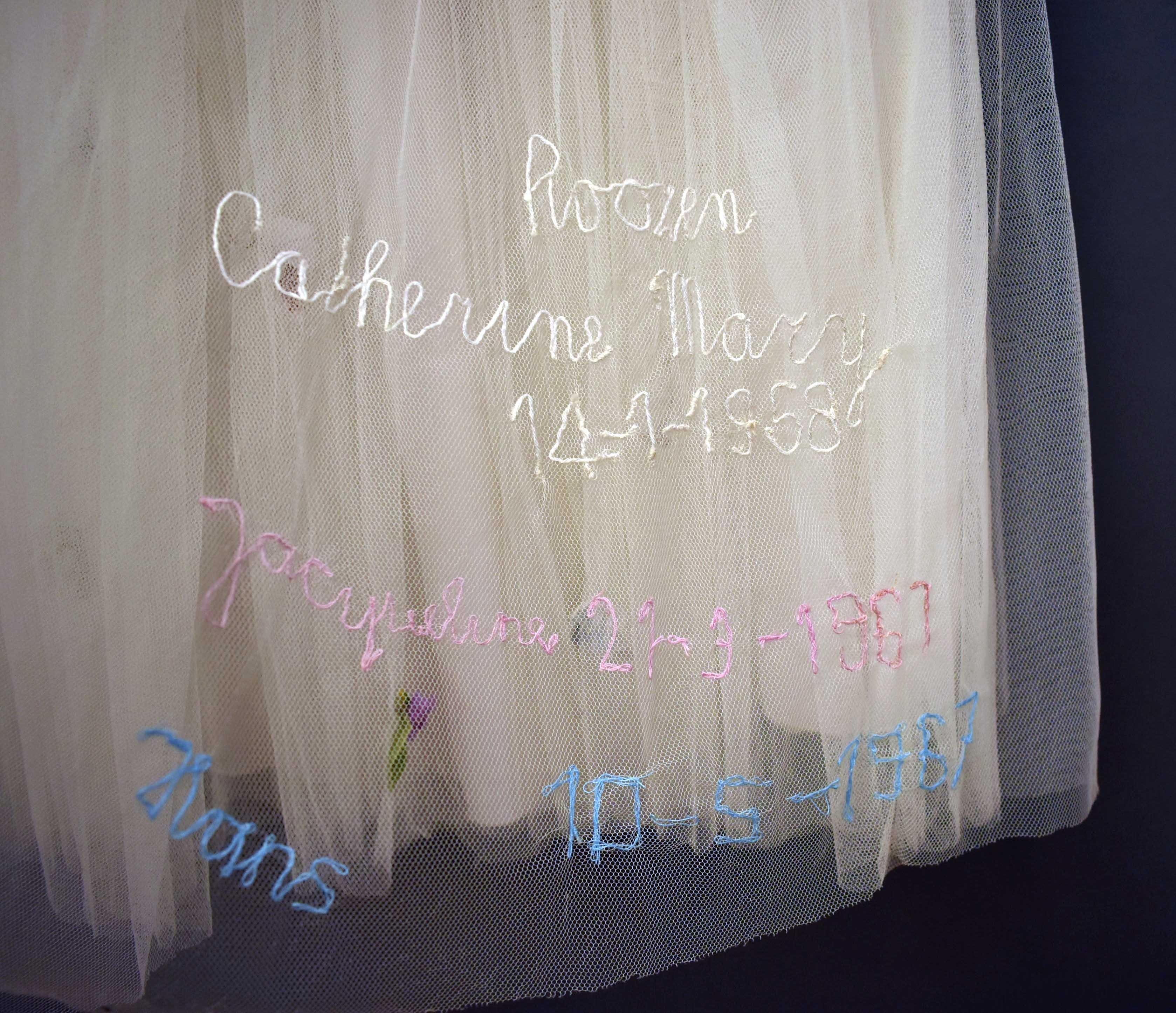 Doopjurk met tule waarop geappliceerde bloemen, geborduurd met "Roozen Catherine Mary 14-1-1958", "Jacqueline 21-3-1961" en "Hans 10-5-1967"