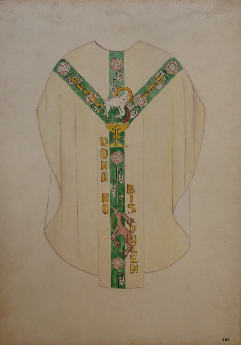 Ontwerp voor wit kazuifel met groen gaffelkruis met Lam Gods bloed stortend in kelk en met hert, met "Agnus Dei dona nobis pacem"